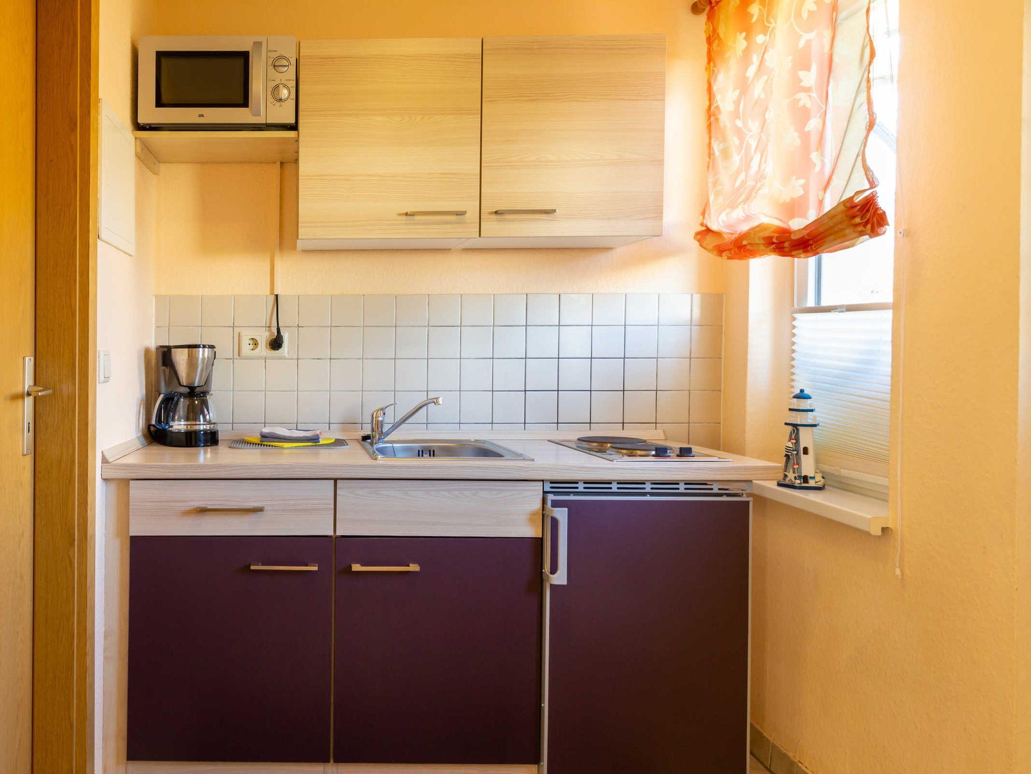 • Küchenzeile (Kühlschrank, 2 Platten- Kochgelegenheit, Kaffeemaschine, Wasserkocher, Toaster)