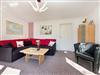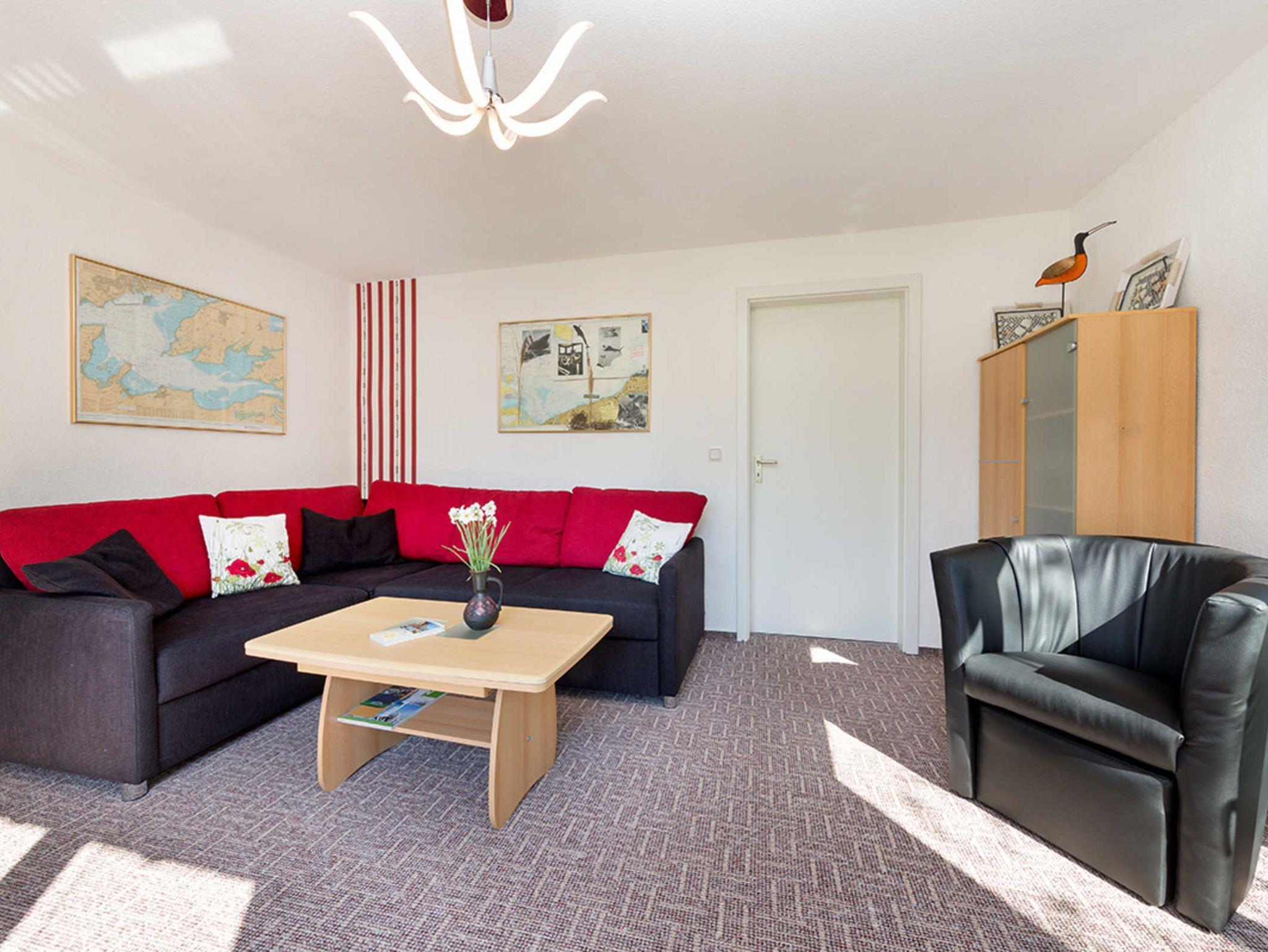 Wohnzimmer mit Flachbild-TV, DVD-/CD-Player, Radio, Tisch, Sessel, 2 Stühl, Schlaf-Eck-Couch in Boxspringqualität (1,40 x 1,80 m);