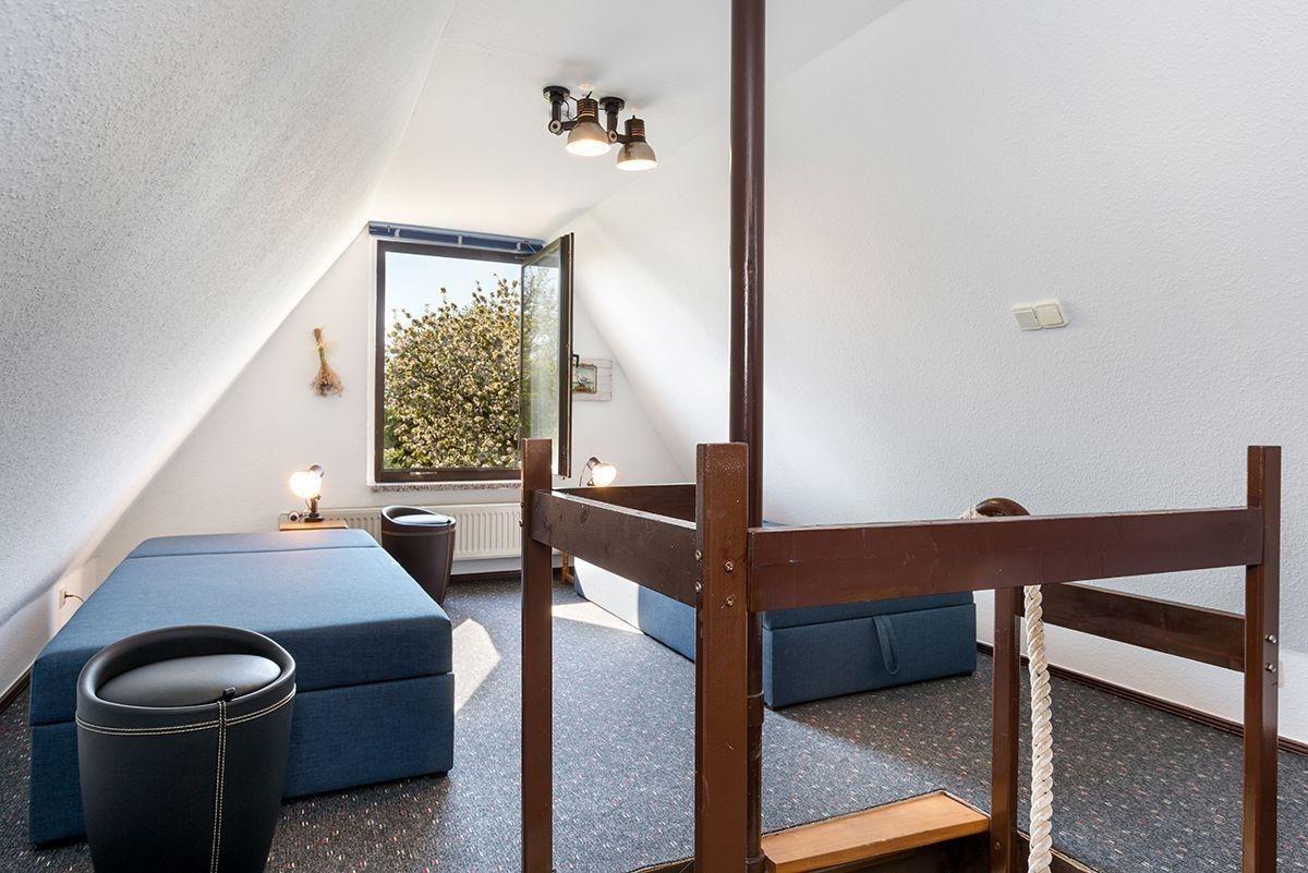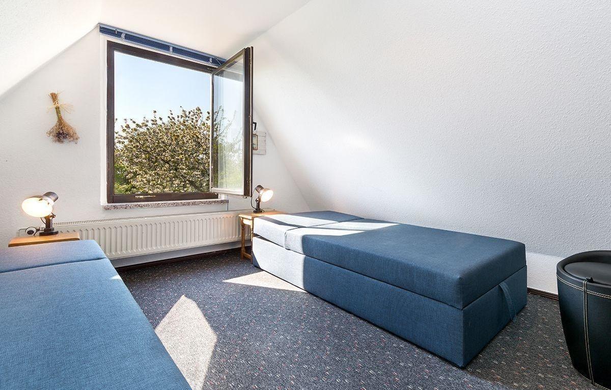 ?großes Schlafzimmer mit zusammenschiebbaren Einzelliegen (Federkern) - es ist ein Durchgangszimmer mit dem Wendeltreppen-Zugang von unten.