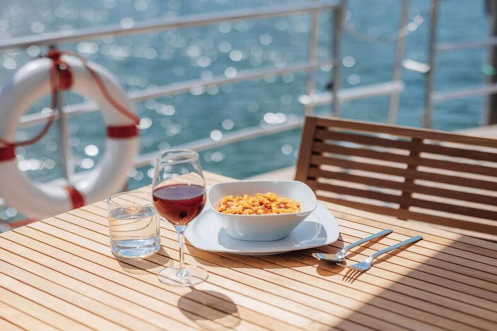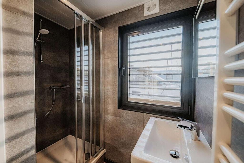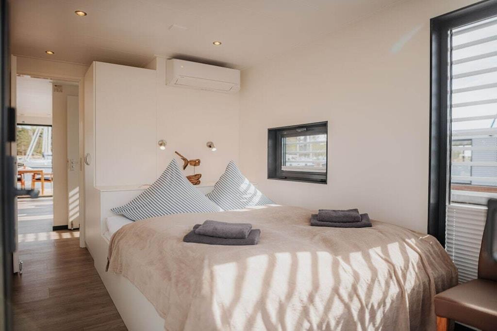 Abtauchen vom Alltag kann so einfach sein! Fest verankert auf den Wellen treibend bietet unser Hausboot mit einer komplett und hochwertig ausgestatteten Wohnfläche und einer Bugterrasse, alles was das Herz begehrt. Entspannen Sie sich nun auf der Terrasse mit wunderschönem und beruhigendem Ausblick auf den See und genießen Sie Ihre Zeit! Schlaf- und Wohnbereich sind stilvoll eingerichtet. Die beiden getrennten Schlafzimmer mit Doppelbetten, die voll ausgestattete Küche und das moderne Dusch-Bad mit separater Toilette bieten allen Komfort, der einen erholsamen Urlaub garantiert. Auf Wunsch können wir auch eine Schlafcouch für eine weitere Person anbieten. Aus dem Wohn- und Essbereich gelangen Sie auf die Terrasse.
