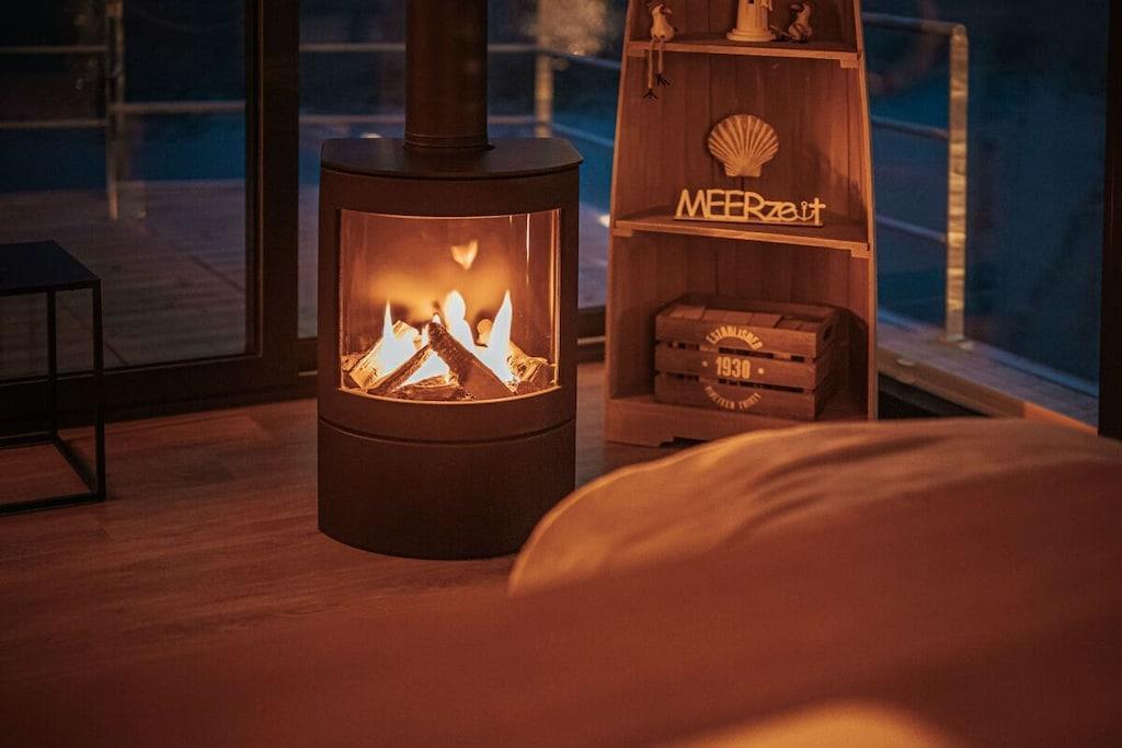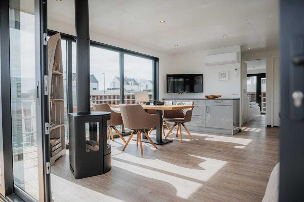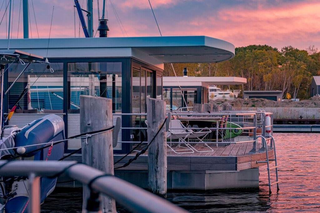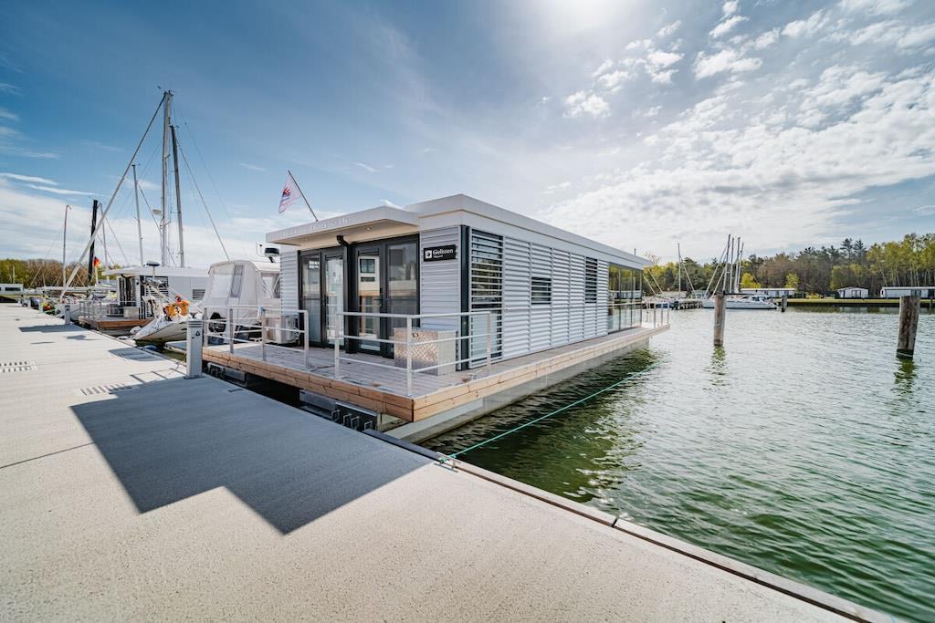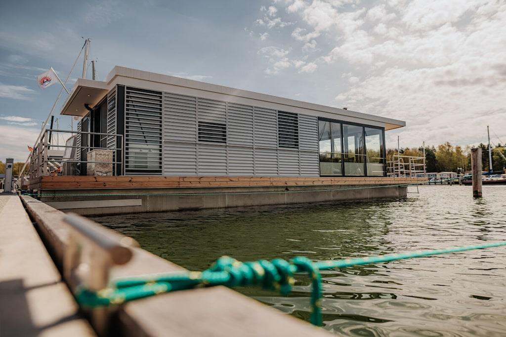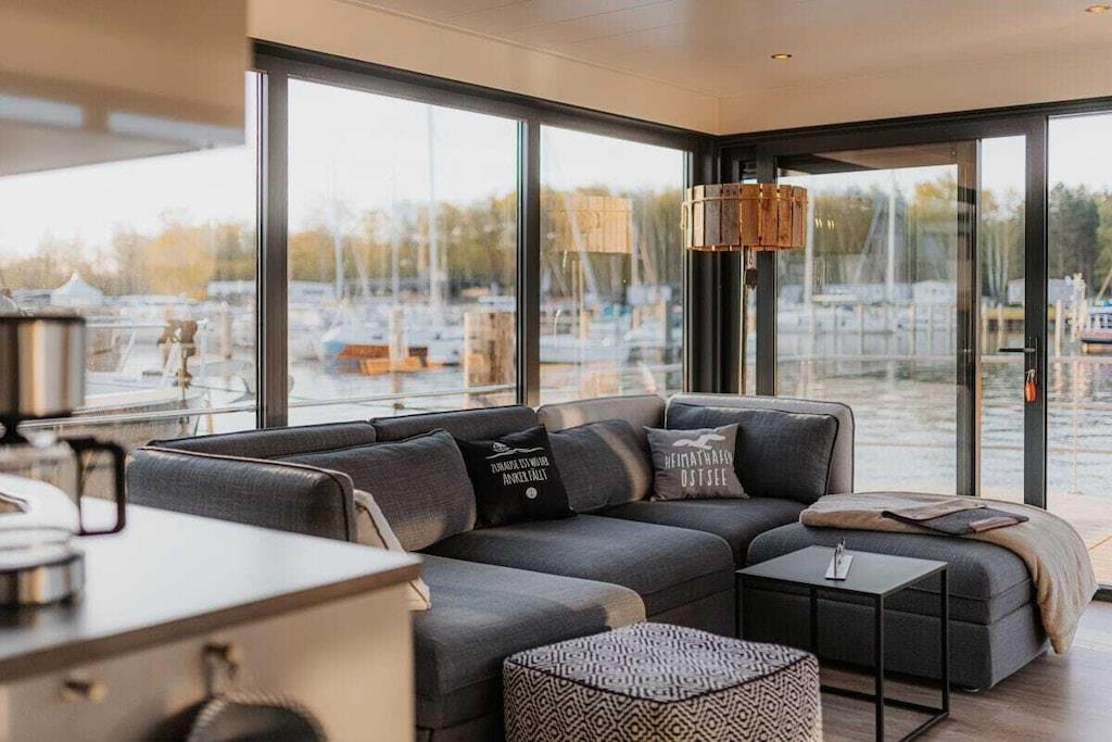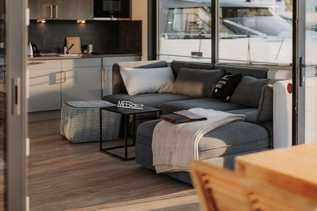 Hausboot in Peenemünde mit stilvollem Interieur und Terrasse am See für erholsame Urlaubstage.