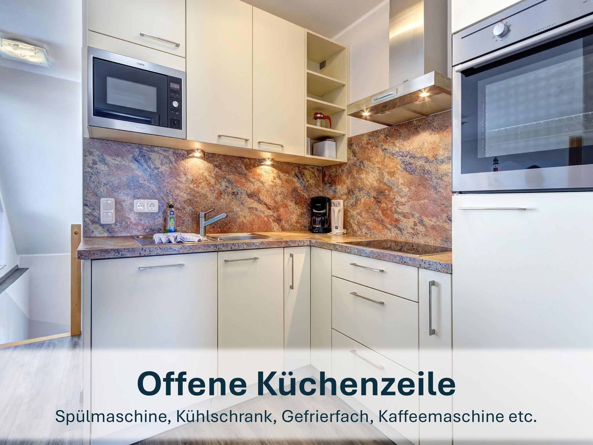 Die offene Küche ist voll ausgestattet und bietet u.a. Spülmaschine, Mikrowelle, Kühlschrank mit Gefrierfach, Cerankochfeld, Backofen, Toaster, Kaffeemaschine und Wasserkocher ? ideal für Selbstversorger.