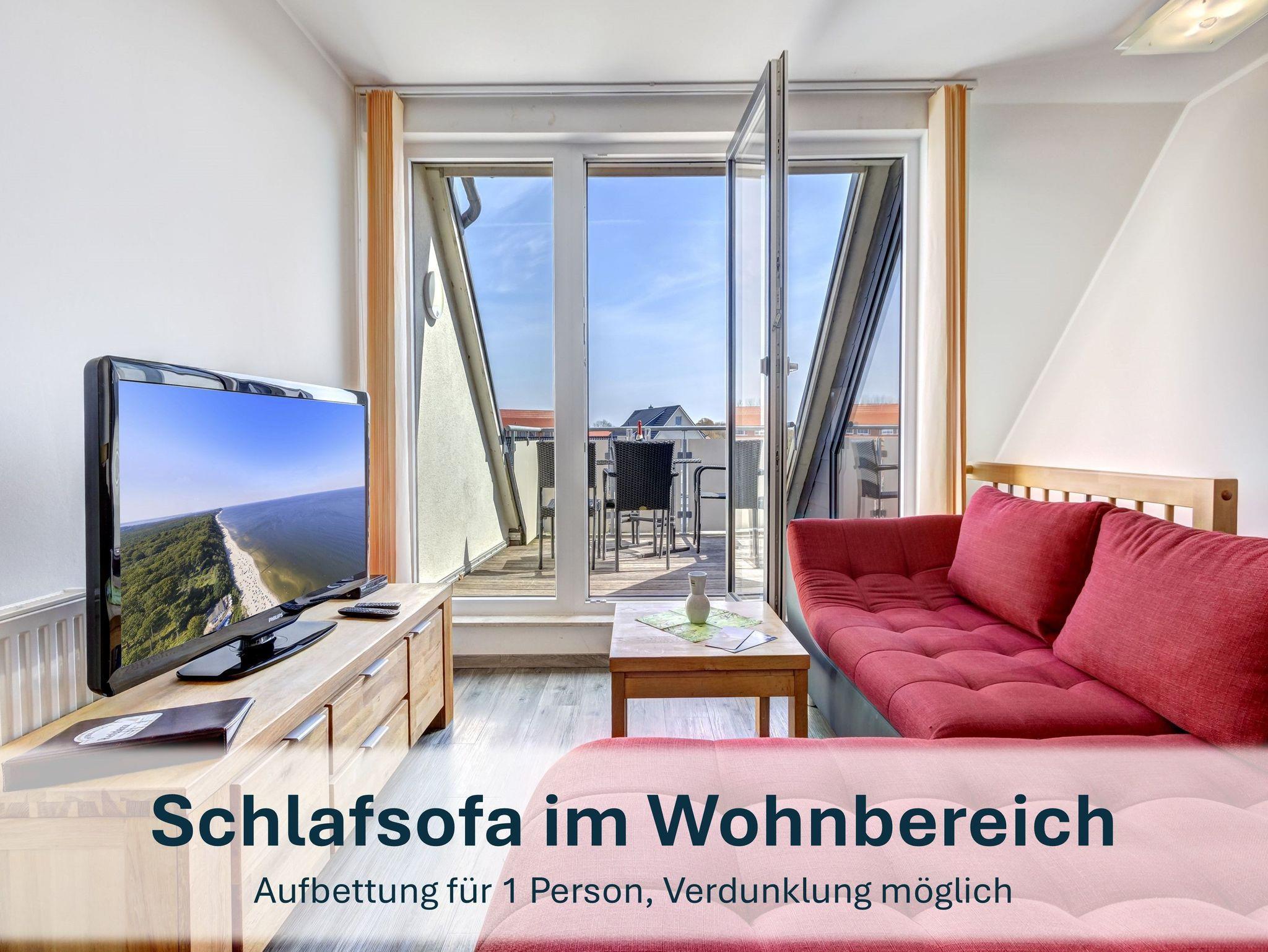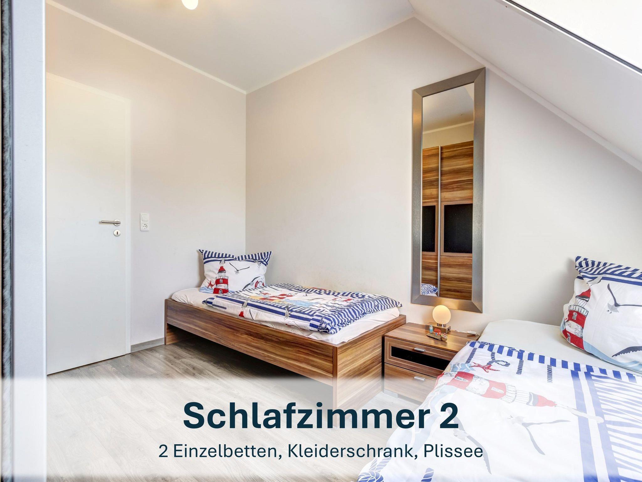 Die Maisonettewohnung „Schoner 14“ erstreckt sich über das Ober- und Dachgeschoss des Hauses und bietet auf ca. 72m² Platz für bis zu 4 Personen. Im unteren Bereich befinden sich das moderne Badezimmer mit Dusche sowie ein Schlafzimmer mit Doppelbett. Über die interne Treppe gelangen Sie ins Dachgeschoss, wo ein zweites Schlafzimmer mit zwei Einzelbetten sowie der gemütliche Wohn- und Essbereich mit Zugang zum möblierten Balkon auf Sie warten.