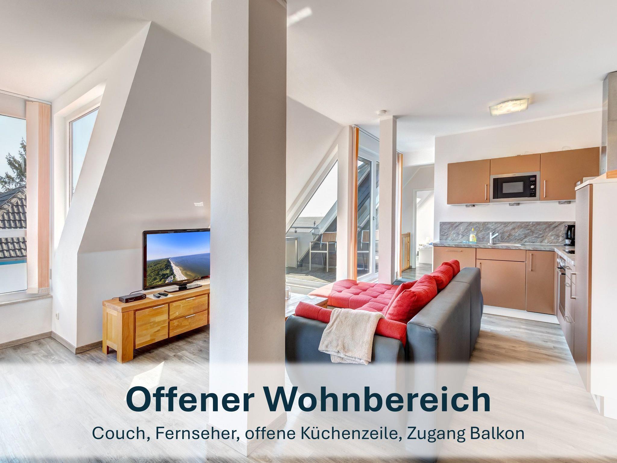 Die Ferienwohnung Nr.12 ist eine gemütliche Maisonettewohnung, die sich über das Ober- und Dachgeschoss erstreckt und ideal für Familien geeignet ist. Sie verfügt über zwei Schlafzimmer ? eines mit Doppelbett, das andere (halb offen) mit zwei Einzelbetten. Der offene Wohnbereich lädt zum Verweilen ein und ist mit einer voll ausgestatteten Küche inklusive Spülmaschine, Kühlschrank mit Gefrierfach, Cerankochfeld, Backofen, Mikrowelle, Wasserkocher, Kaffeemaschine und Toaster eingerichtet. Die Loggia mit Essecke und Außenrollos bietet einen gemütlichen Platz mit Ausblick, zusätzlich steht ein Balkon zur Verfügung. Das Badezimmer ist mit Dusche und Badewanne ausgestattet.