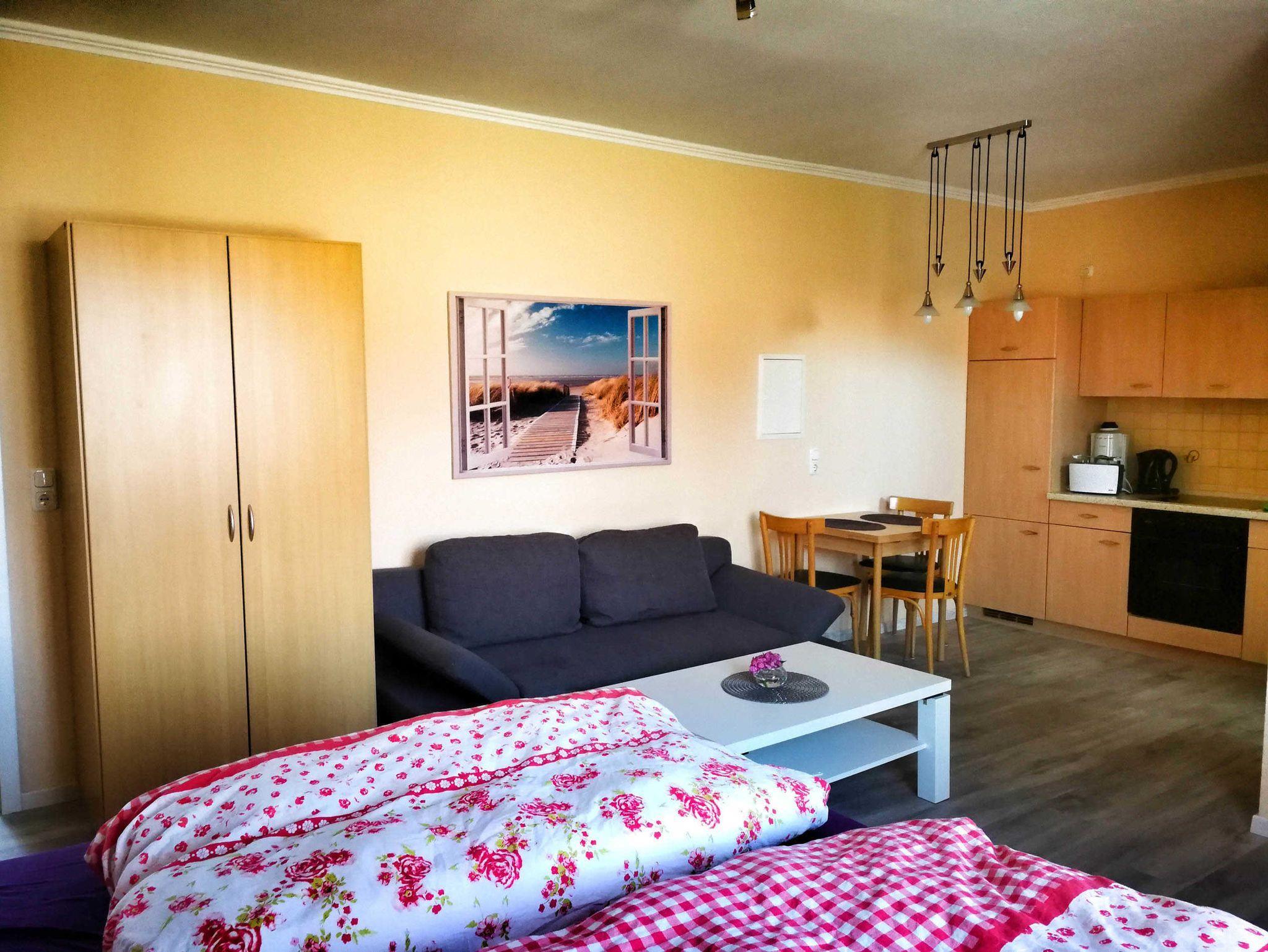 Charmantes Studio Kleiner Seehund in Peenemünde mit offener Küche, Doppelbett und Sitzgelegenheiten im Außenbereich.
