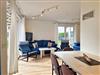 Eine weitere Tür führt in den Wohnraum, in den eine offene Küchenzeile integriert ist. Die Sitzgruppe in gedecktem Meeresblau lädt dazu ein, die Füße hochzulegen und einmal richtig auszuspannen. Bei Bedarf sorgt der Kamin für gemütliches Flammenknistern und wohlige Wärme.