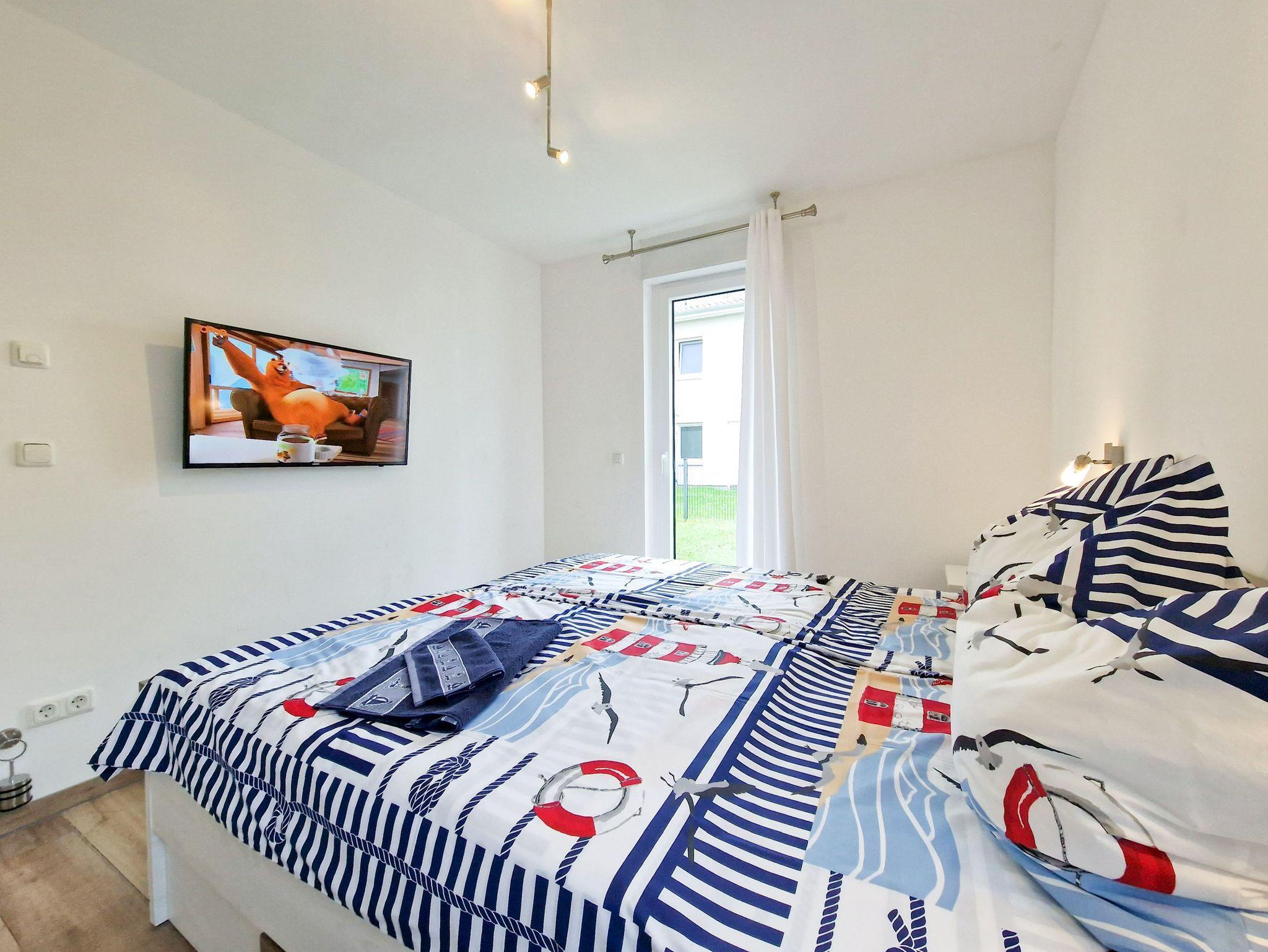 Im Schlafzimmer, vom Wohnraum aus zugänglich, steht ein Doppelbett (zwei 90 cm breite Matratzen); in den Schränken finden Sie Stauraum für Ihre Urlaubsgarderobe.