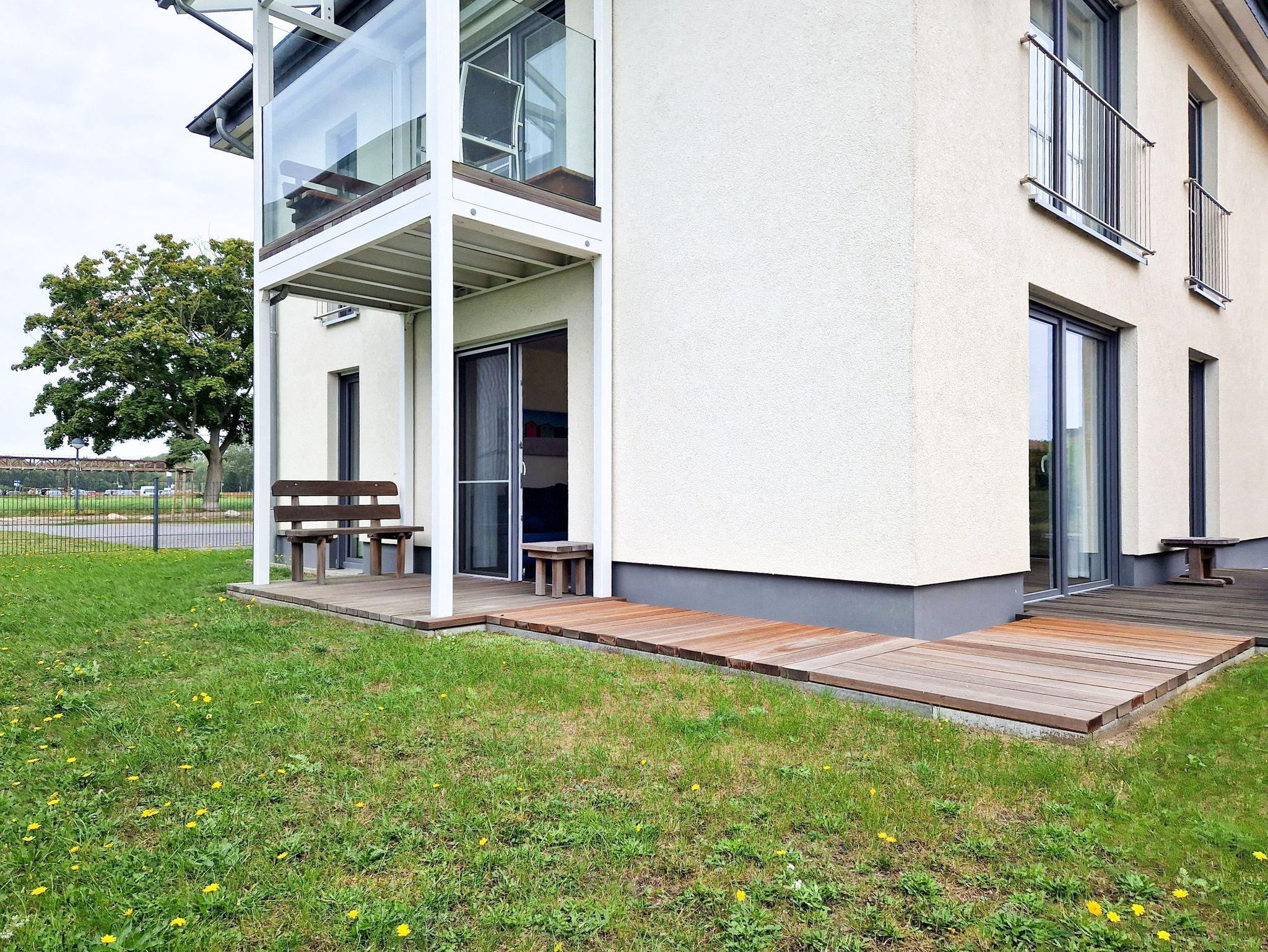 Zur Wohnung gehören weiterhin eine Haupt- und eine kleinere Terrasse mit angrenzendem Rasenbereich. Die größere Terrasse ist der ideale Schauplatz für ein sommerliches Barbecue mit allerlei Leckerem vom Rost. Bitte nehmen Sie dabei Rücksicht auf Ihre Nachbarn und ggf. weitere Feriengäste. Ein Grill ist nicht vorhanden!