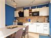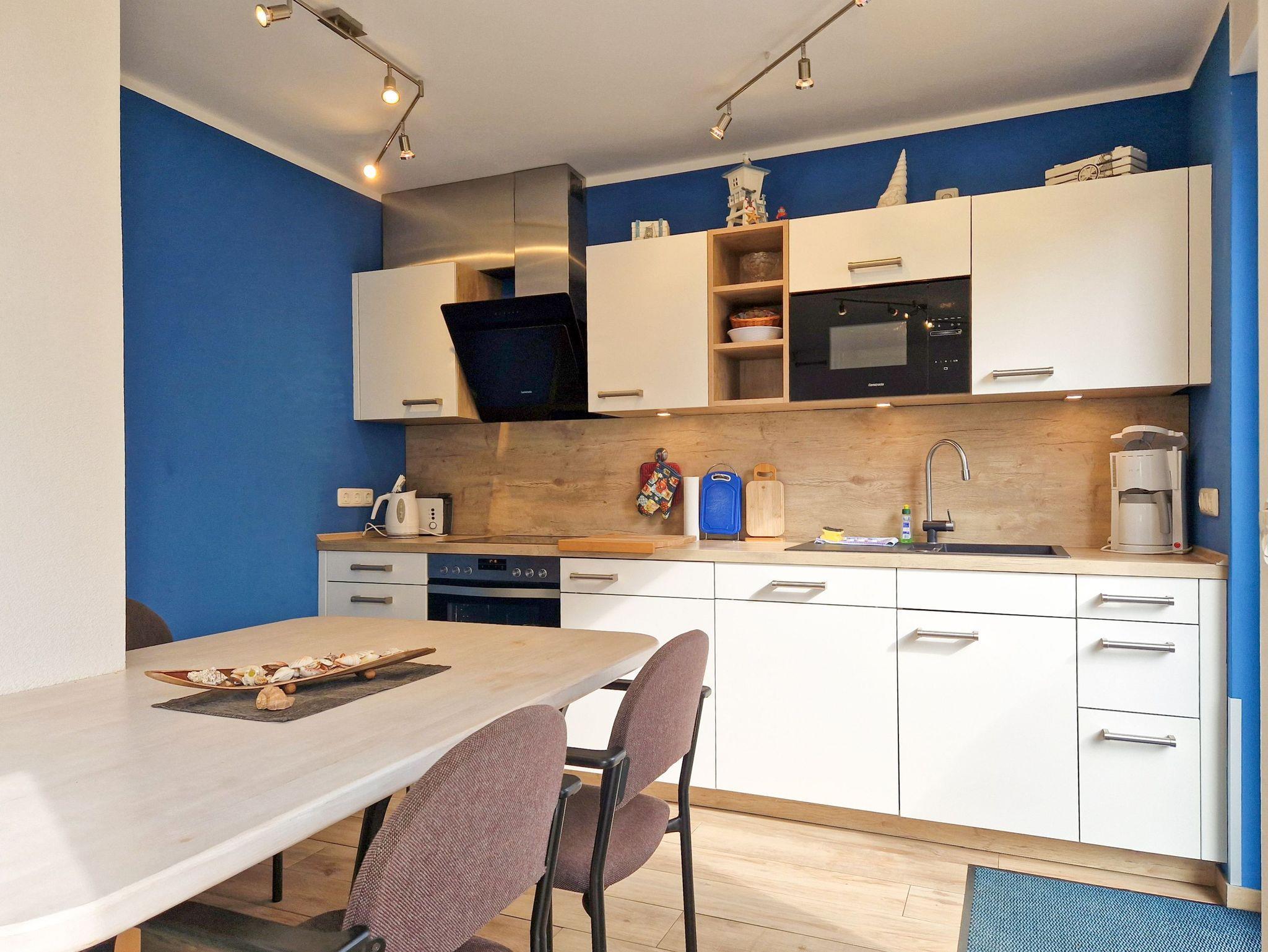 Um die Ecke gelangen Sie in den Küchenbereich. Zur modernen Ausstattung gehören Cerankochfeld mit Backofen, Mikrowelle, Spülmaschine, Kühlschrank mit Gefrierfach und Kleingeräte wie Toaster, Wasserkocher und Kaffeemaschine, die Ihnen den Start in den Tag erleichtern! In der Küche wird die Akzentfarbe Blau noch einmal aufgegriffen, sodass insgesamt ein harmonisches Raumgefühl entsteht.