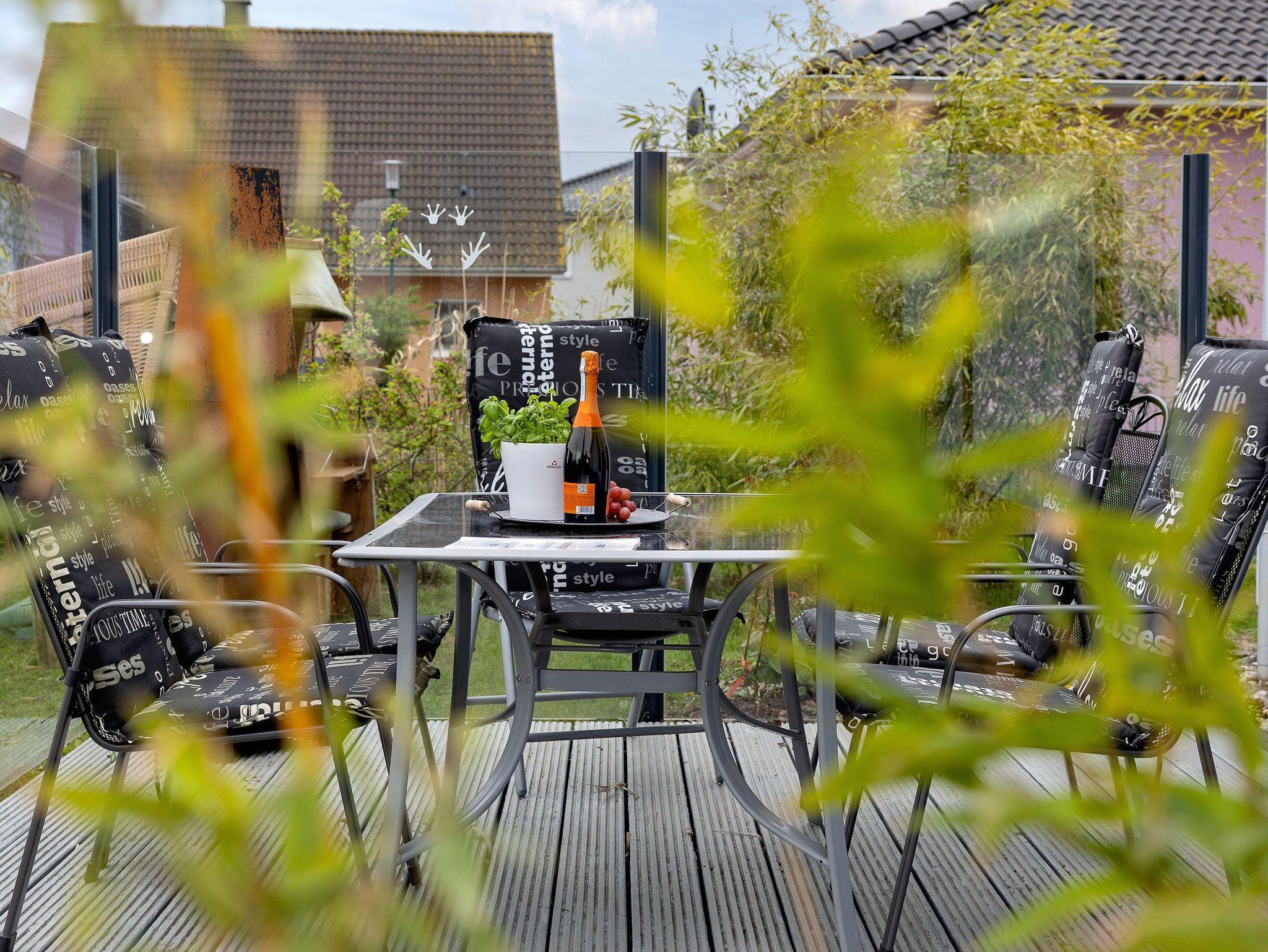 -1 Terrasse mit Gartenmöbel, Windschutz, Terrassenofen und Gartengrill