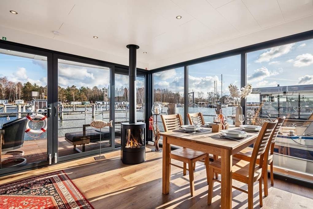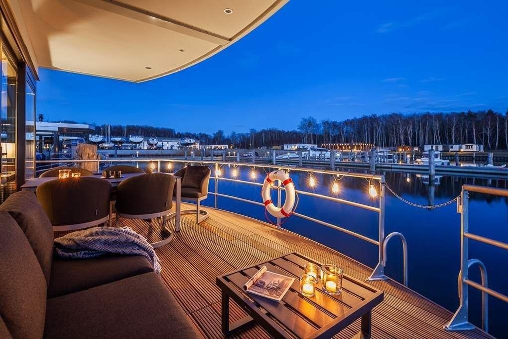 Erleben Sie Erholung pur auf diesem stilvollen Hausboot mit Terrasse und Seeblick in Peenemünde an der Ostsee.