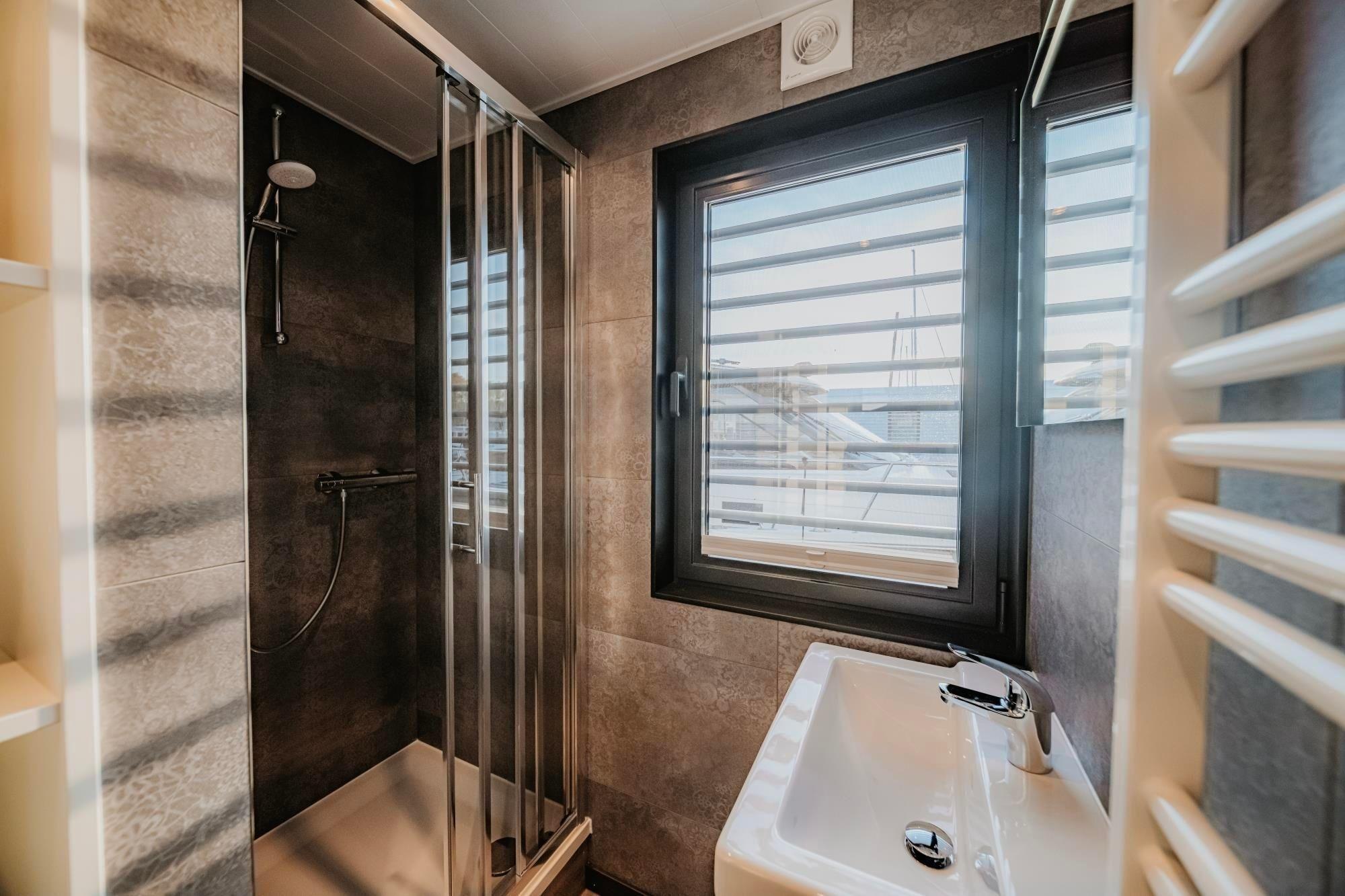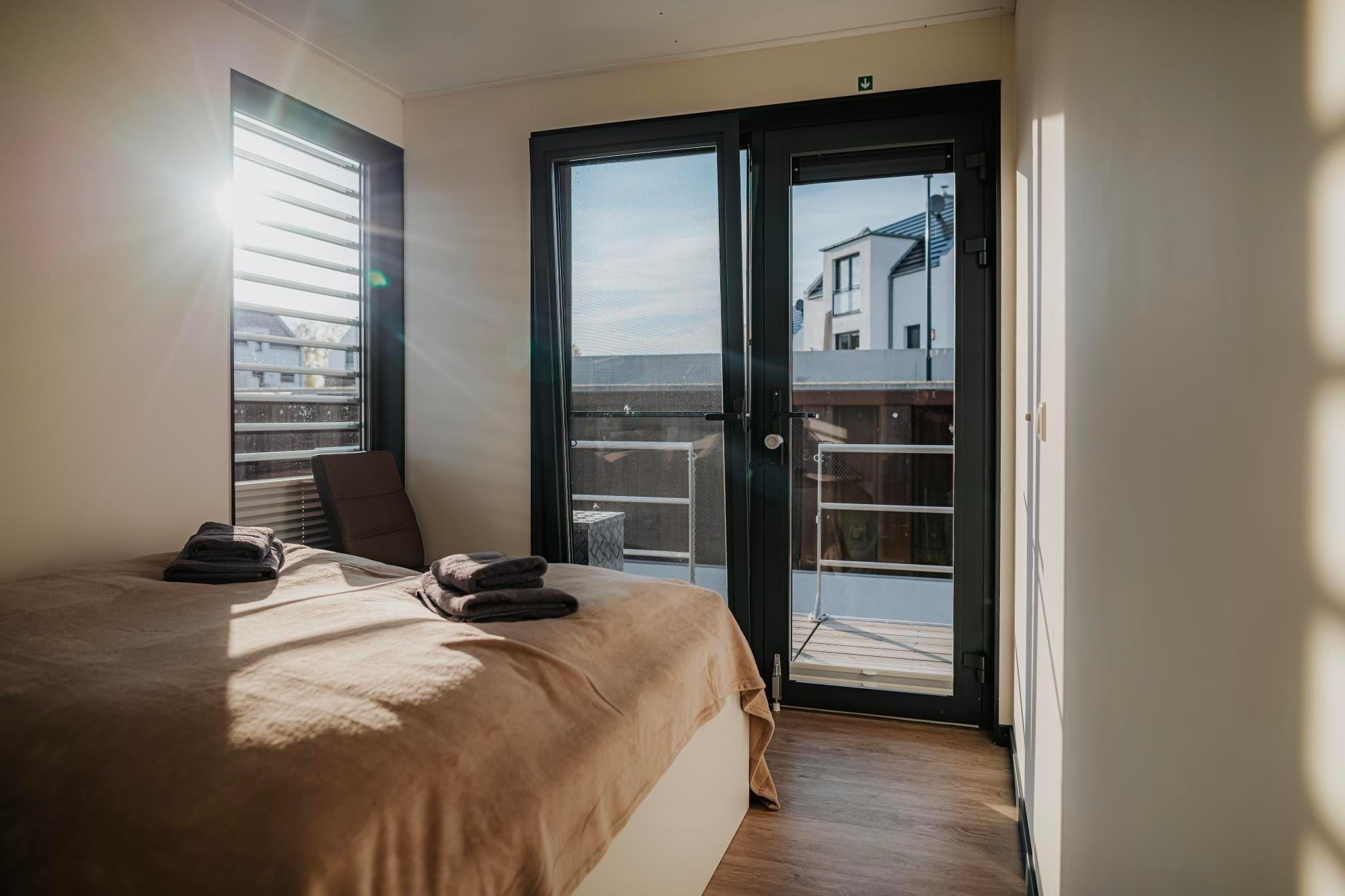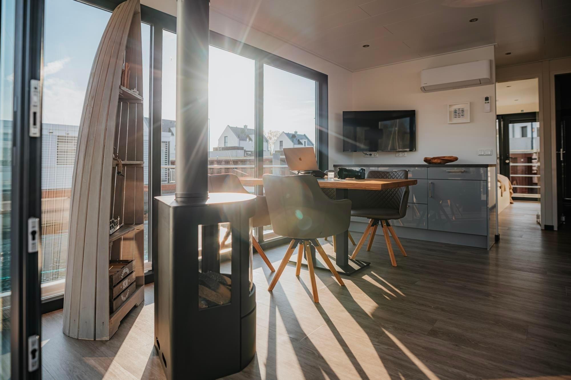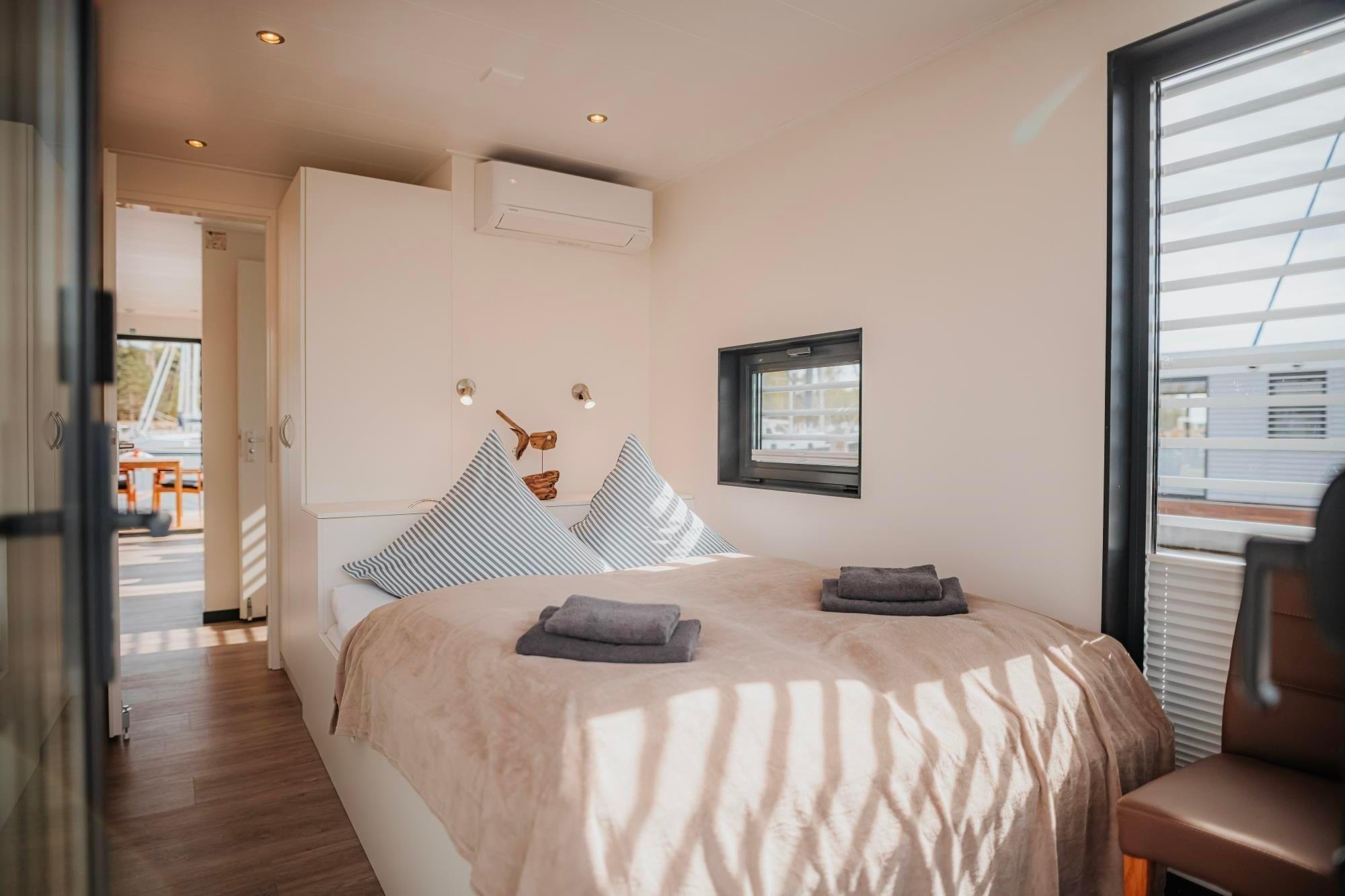 Das Hausboot "Trinity" ist ein floating 44. Es besitzt 2 Schlafzimmer mit je einem Doppelbett. Das Badezimmer ist mit einer Dusche ausgestattet und einem separaten WC. Der Wohn- und Essbereich ist ein stilvoll eingerichteter Raum mit einer dreiseitigen Glasfront. Der Kamin rundet das einmalige Erlebnis ab.