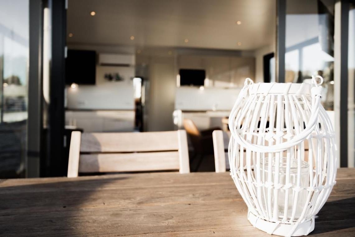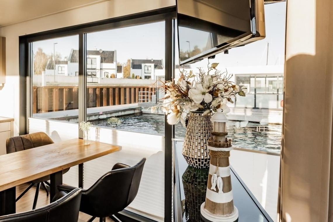 Aus dem Wohn- und Essbereich gelangen Sie auf die Terrasse. Hier können Sie Ihre Mahlzeiten genießen. Erleben Sie das Gefühl von Freiheit auf dem Wasser!
