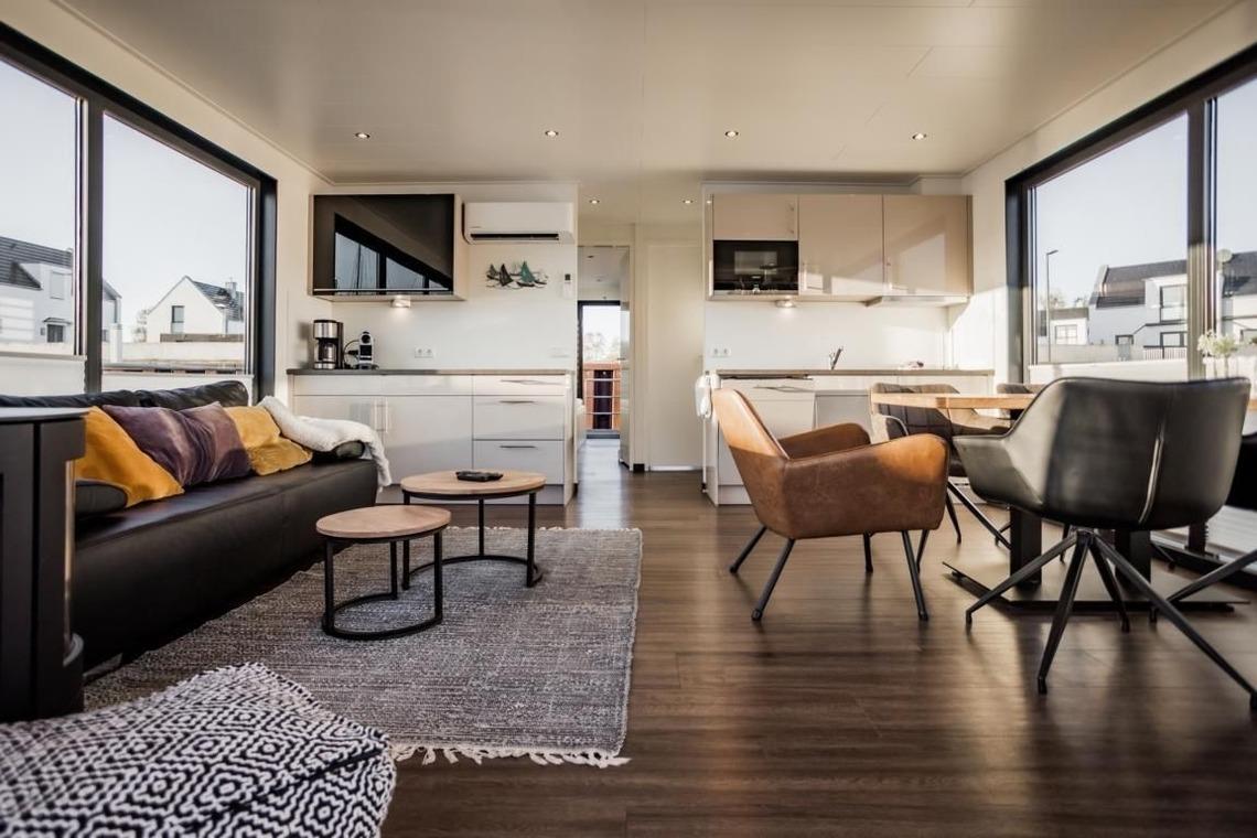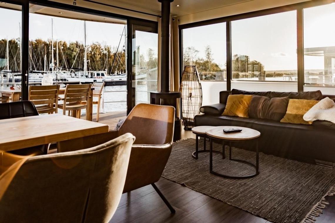 Hausboot "freiZeit" in Peenemünde bietet einzigartiges Wohnerlebnis mit Kamin und Seeblick auf 45m².