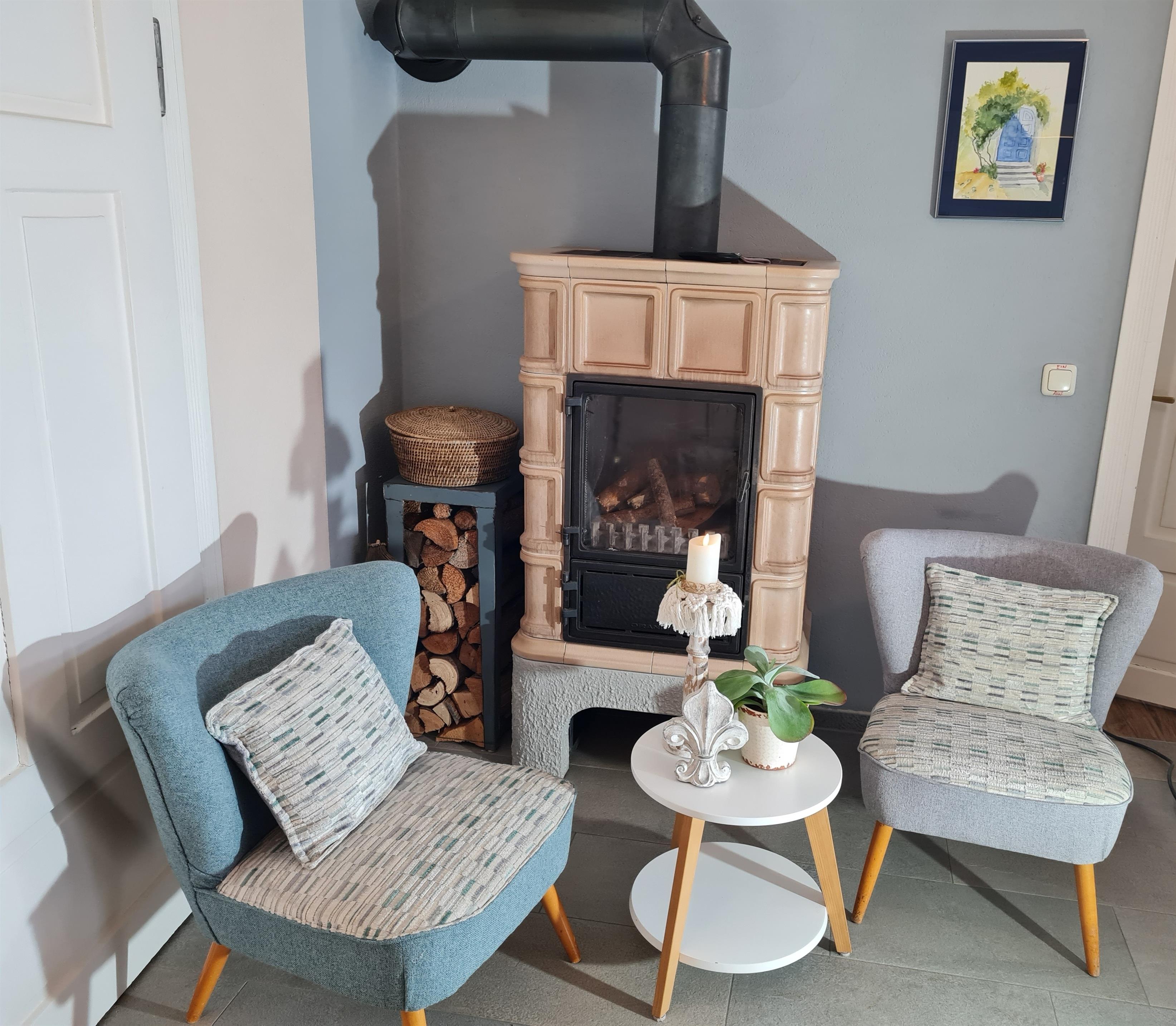 Im Wohnzimmer befindet sich ein romantischer und gemütlicher Holzofen.