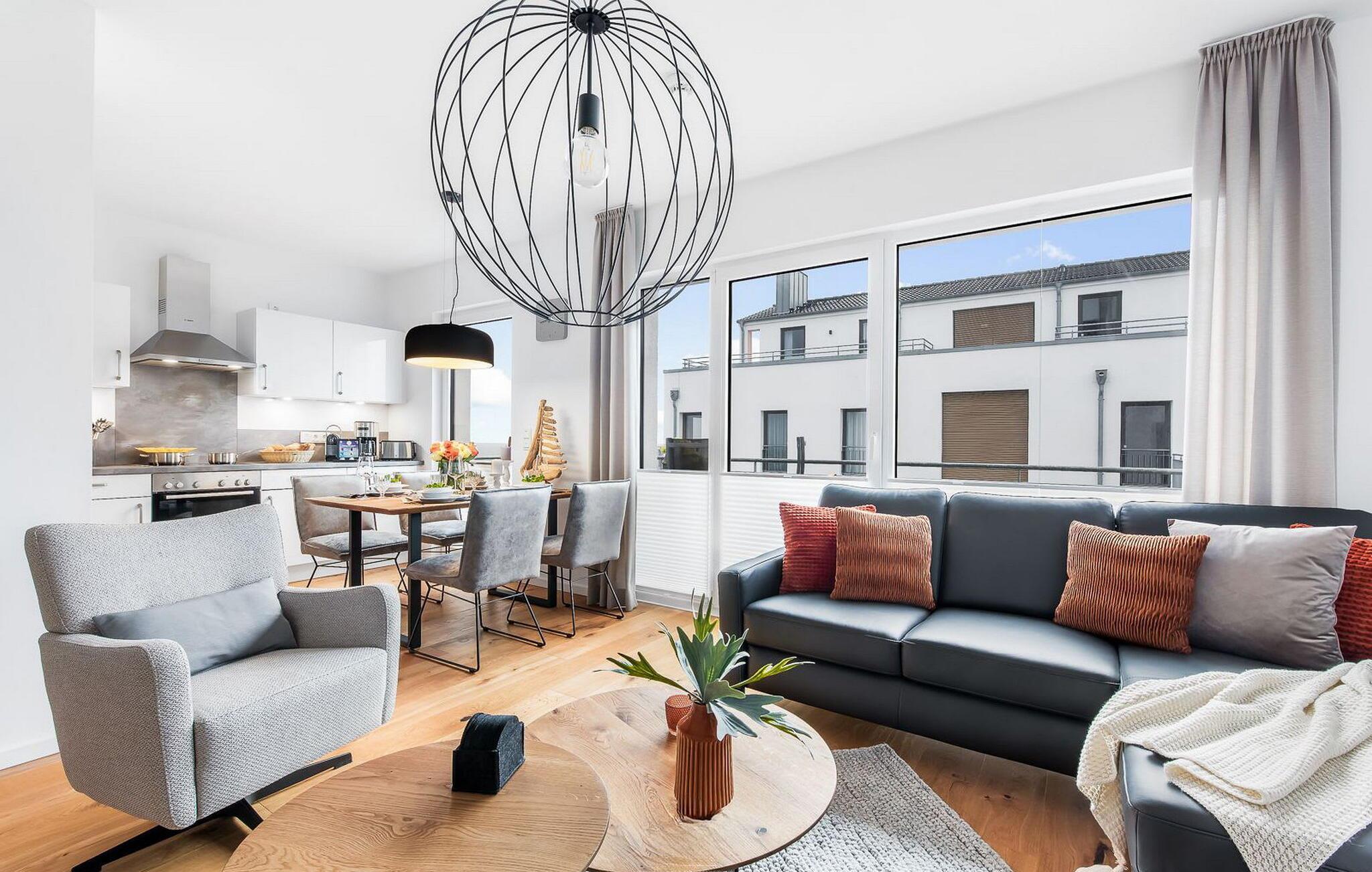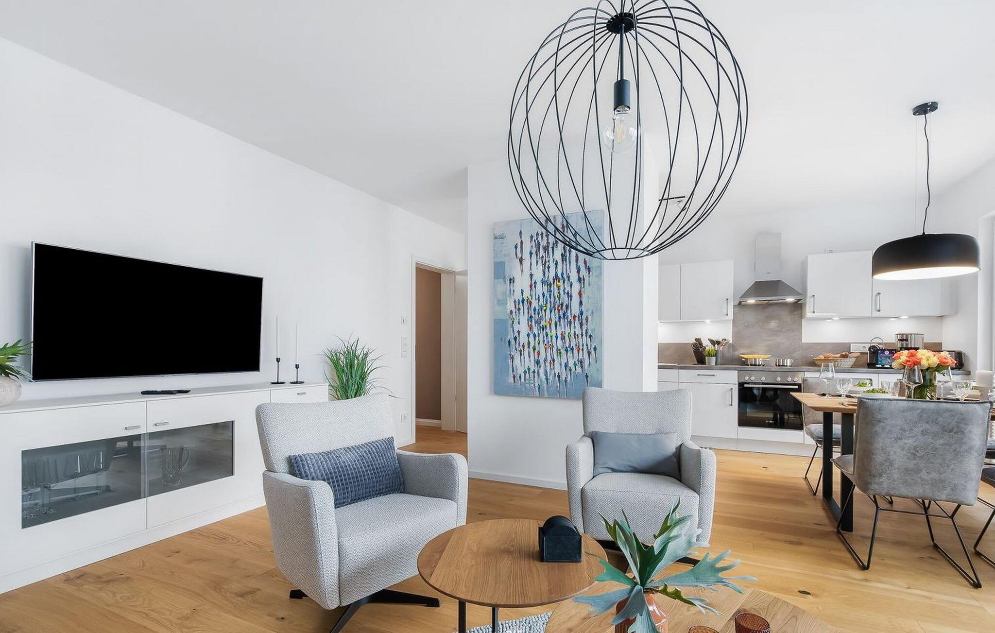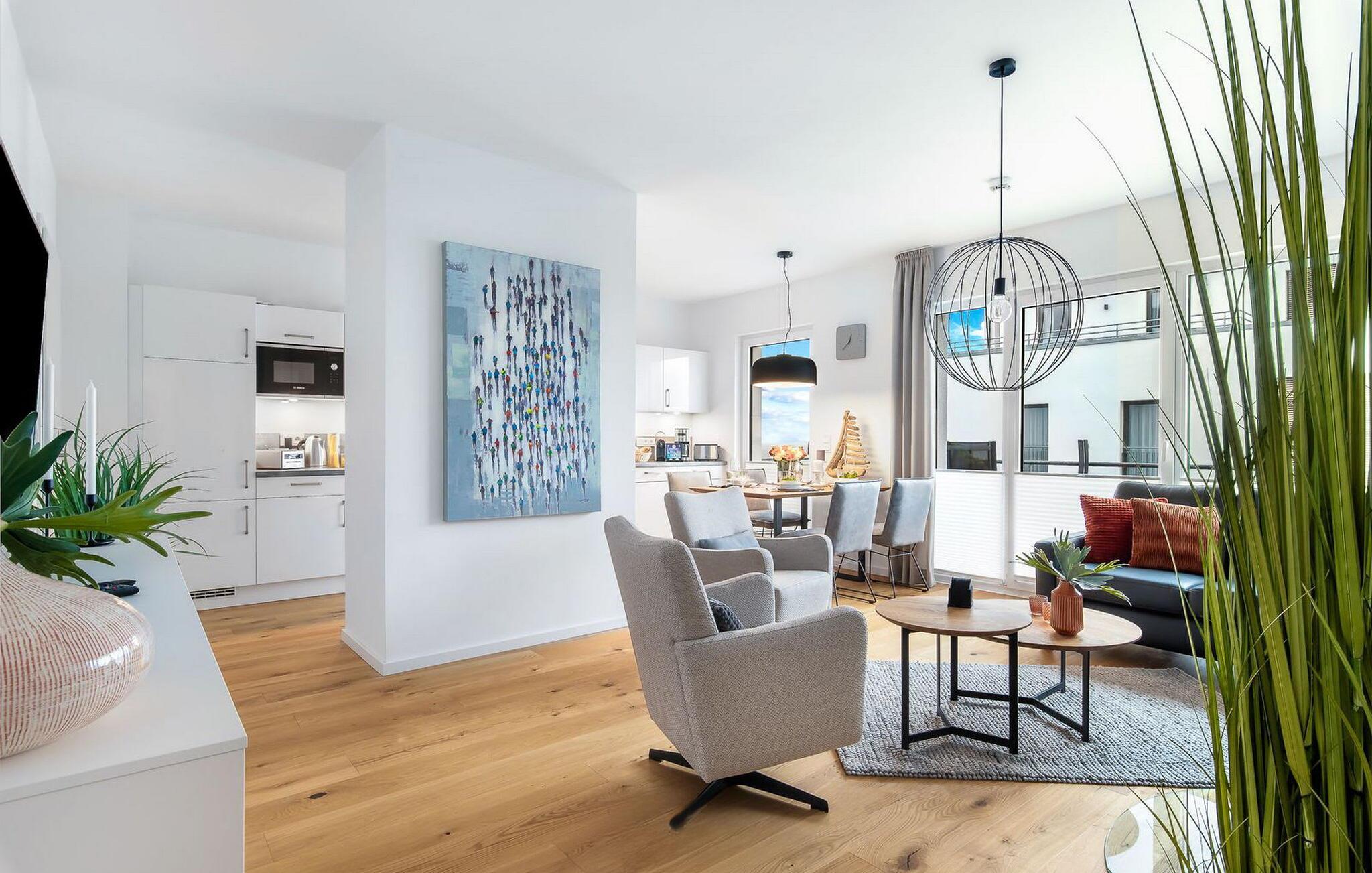Die Ferienwohnung PEILDECK verfügt über einen großzügigen Wohn-/Essbereich mit Echtholzparkettboden. Die bodentiefen Fenster sorgen für eine angenehme und lichtdurchflutete Atmosphäre. Der angrenzende Südbalkon lädt zum Entspannen und Verweilen ein. Hier können Sie bei einem Glas Wein die wundervollen Sonnenuntergänge über dem OstseeResort Olpenitz beobachten.