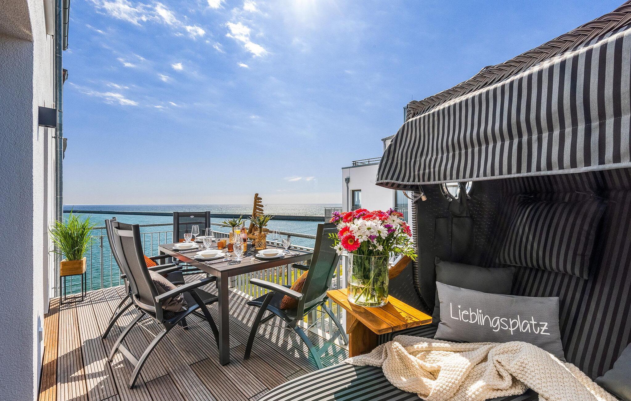 Unser Lieblingsplatz: Den Tag mit einer Tasse Kaffee auf dem Balkon im Strandkorb beginnen und den Möwen lauschen. Freuen Sie sich auf einen wunderschönen Urlaub im PEILDECK an der Ostsee, egal zu welcher Jahreszeit!