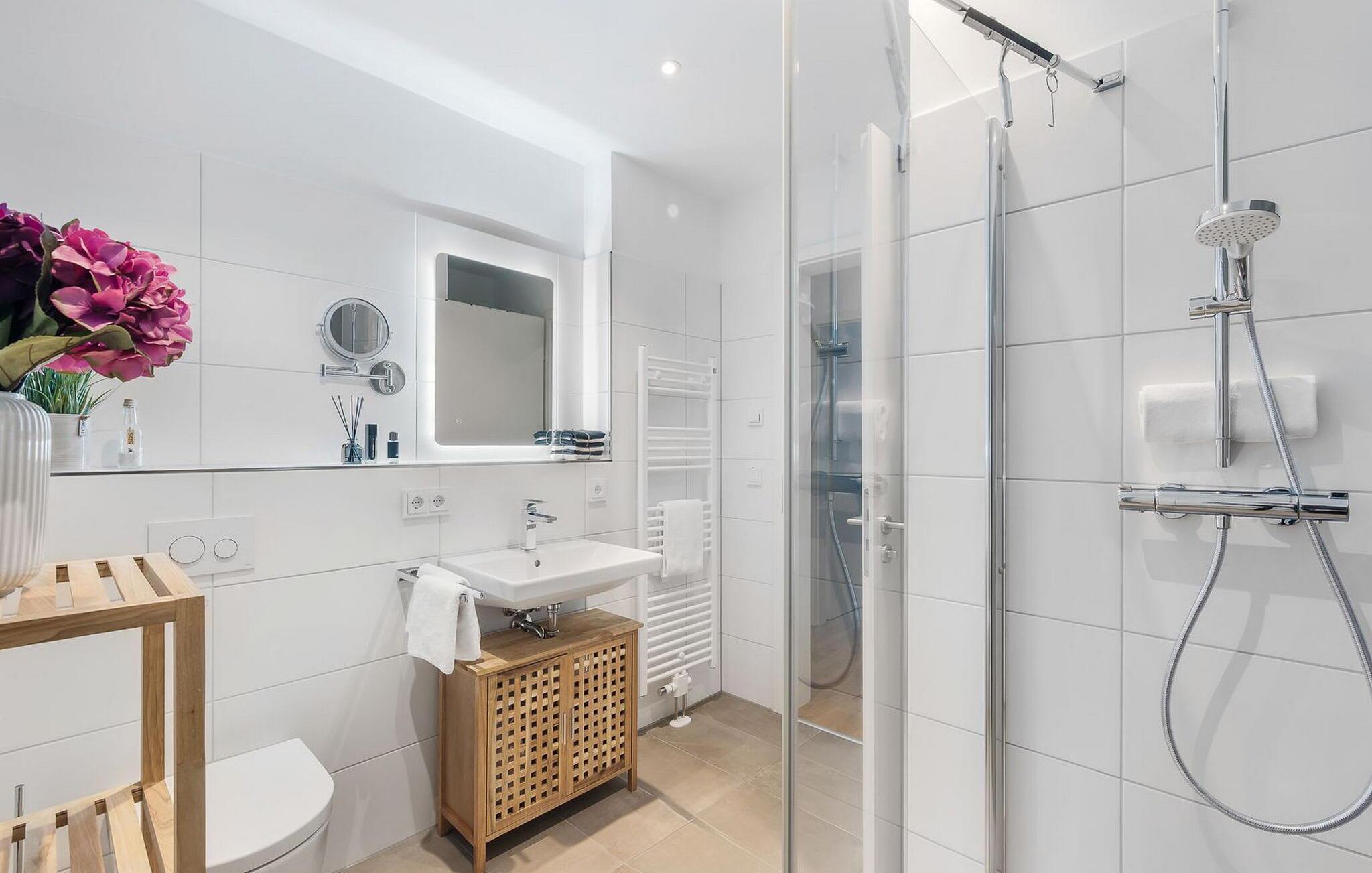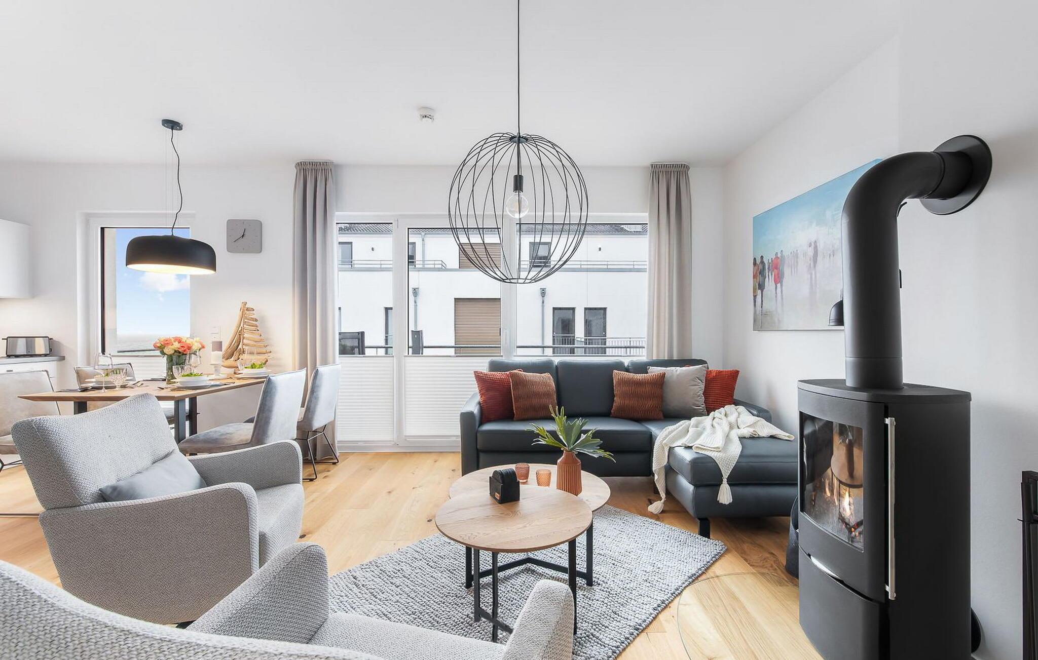 Die hochwertig und stilvoll eingerichtete Ferienwohnung lässt keine Wünsche offen und verwöhnt ihre Gäste auch an ungemütlichen nordischen Tagen mit einem knisternden Kaminfeuer und einer Fußbodenheizung, die den Wohnbereich in eine absolute Wohlfühloase verwandelt. Kuscheln Sie sich auf das bequeme Ledersofa und beobachten Sie durch den seitlichen Meerblick die raue See. 3 Flachbildfernseher mit Home-Entertainment-Programmen sorgen für Unterhaltung im Haus. Zudem bringt Sie ein Aufzug mühelos direkt vor die Tür Ihres Ferienhauses im 3. OG.