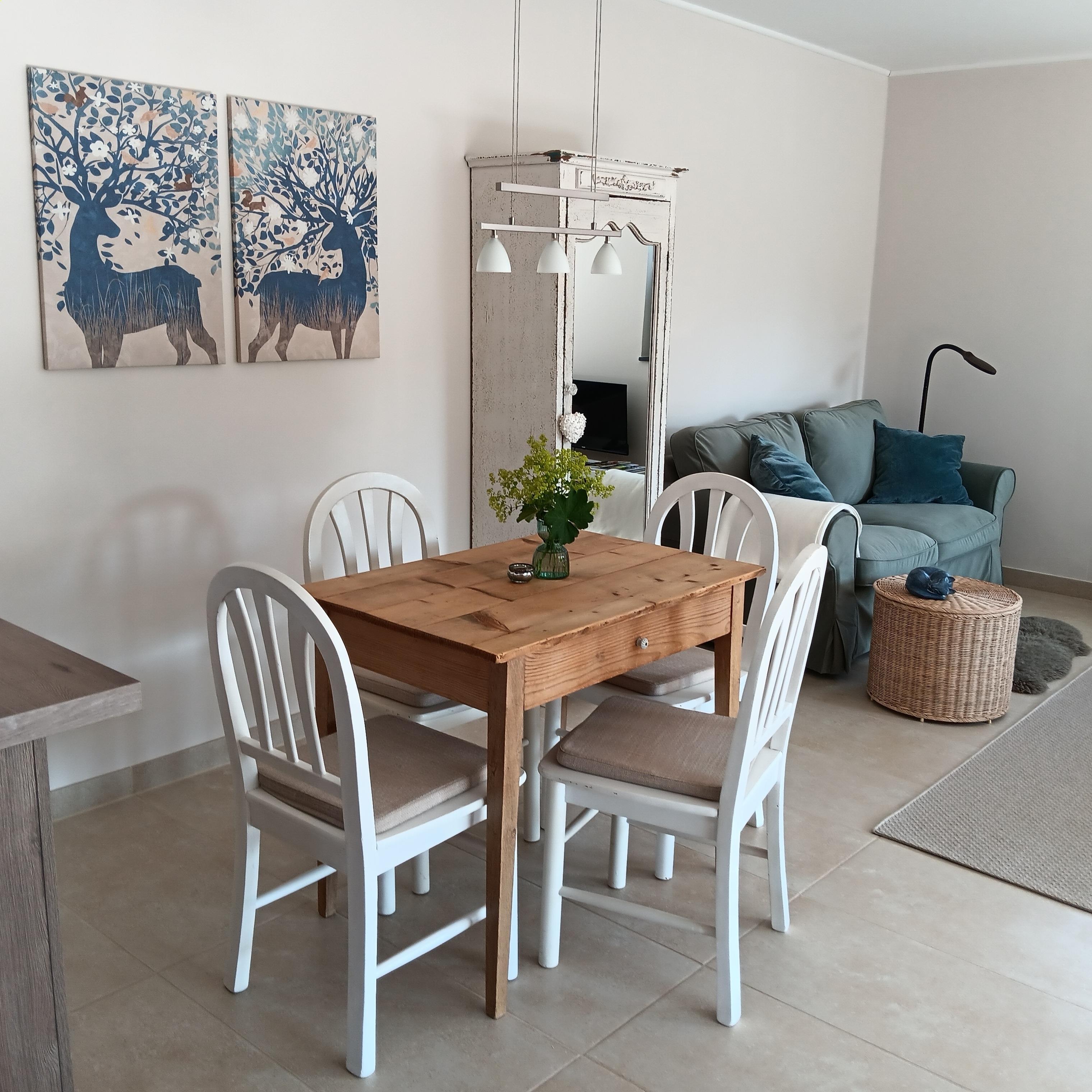 Der aparte Wohnraum lädt zum relaxen ein und man hat ausreichend Platz, um sich rundherum wohl zu fühlen, alles ist hell und freundlich. Auch ein kleiner Fernseher steht zum Entspannen bereit.