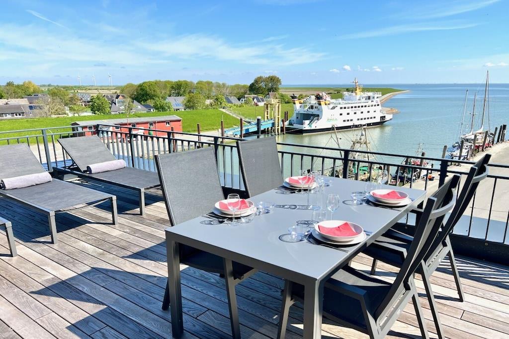 Erleben Sie im Penthouse auf Pellworm einen atemberaubenden Panoramablick und entspannen Sie auf der großen Dachterrasse mit Sauna.