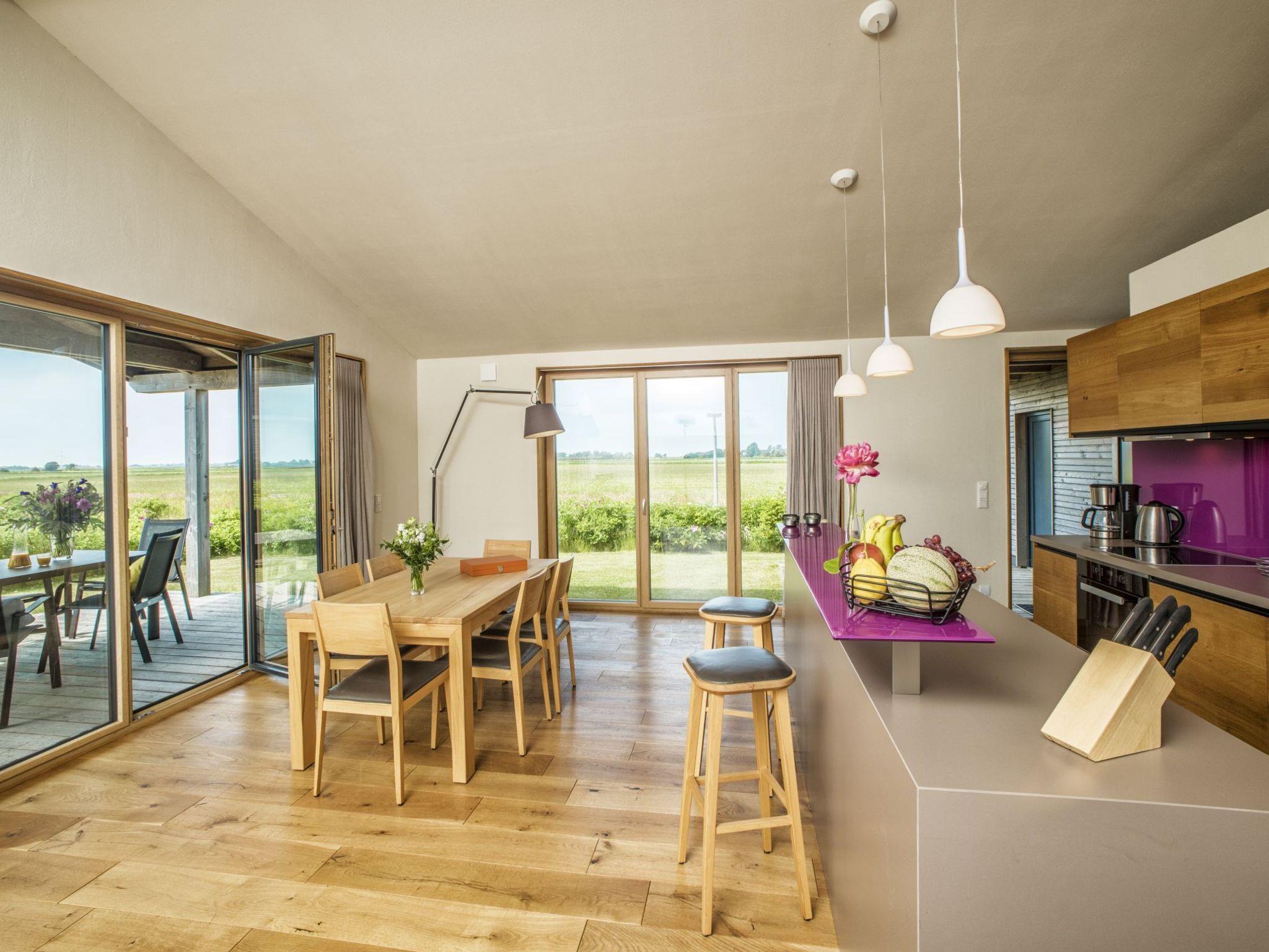 Ihre Mahlzeiten können Sie ganz in Ruhe auf einer der großen Terrassenflächen (teilweise überdacht) einnehmen. Ein Terrassentisch und 6 Stühle sind dafür vorhanden. Zwei Liegen laden auf der Sonnenterrasse zum ausgiebigen Sonnenbaden ein. Der Garten bietet viel Erholungs- und Spielfläche. Auch in den kühleren Monaten ergänzen sich Natur und Haus perfekt. Machen Sie es sich nach ausgiebigen Deichwanderungen in frischer Meeresluft einfach mit einem guten Buch in der Sauna oder auf dem Sofa gemütlich oder geben Sie sich dem hin, was hier am besten funktioniert: dem gepflegten Nichtstun!