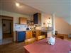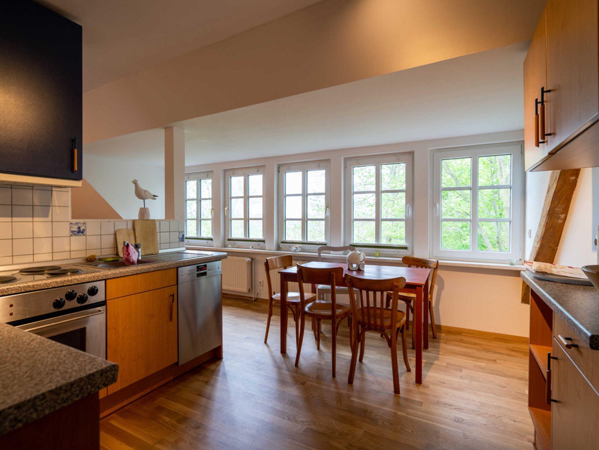 In dieser Wohnung gibt es eine Wohnküche mit Geschirrspüler, 4-Platten-Herd, Backofen und Kühlschrank.