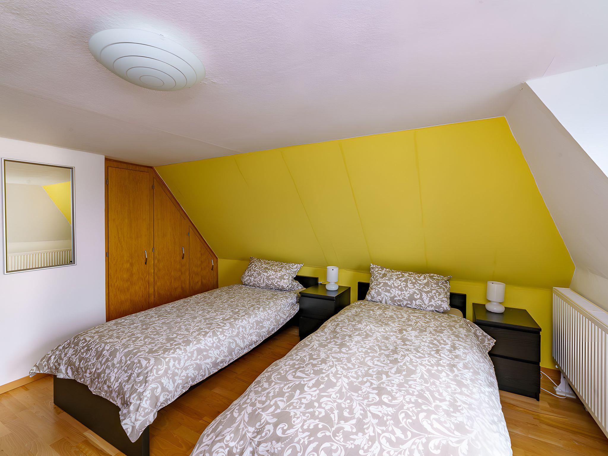 Das Obergeschoss erreichen Sie über eine schmale Treppe. Dort befindet sich eine Galerie mit einem Arbeitsplatz mit LAN-Anschluss und Blick in den Norden der Insel. Im oberen Schlafzimmer gibt es zwei Einzelbetten, ein Sofa mit Tisch und einen Flachbild-TV. Von dort aus gelangen Sie auf den Balkon mit einer weiteren Sitzmöglichkeit.