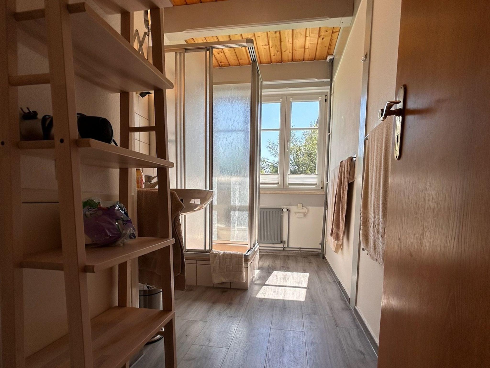 Im Schlafzimmer befindet sich ein Doppelbett und Kleiderschrank. Im großen Badezimmer gibt es eine Dusche und ein WC. Ein Fön gehört auch dazu.