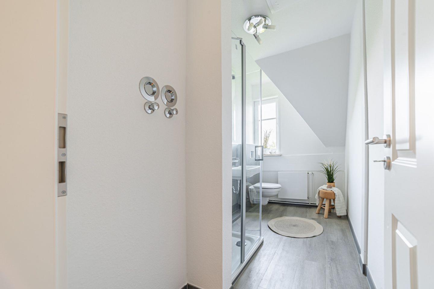 Das moderne Badezimmer ist mit einer bodengleichen Dusche, WC, Waschbecken, Spiegel, Kosmetikspiegel sowie einem Ganzkörperspiegel ausgestattet. Handtücher, Badetücher sowie Pflegeutensilien wie Seife und Shampoo werden als Erstausstattung bereitgestellt. Für Ihren Komfort stehen ein Haartrockner sowie ein Staubsauger zur Verfügung. Die gemeinsame Waschmaschinennutzung im Haus ermöglicht es Ihnen, auch längere Aufenthalte angenehm zu gestalten.