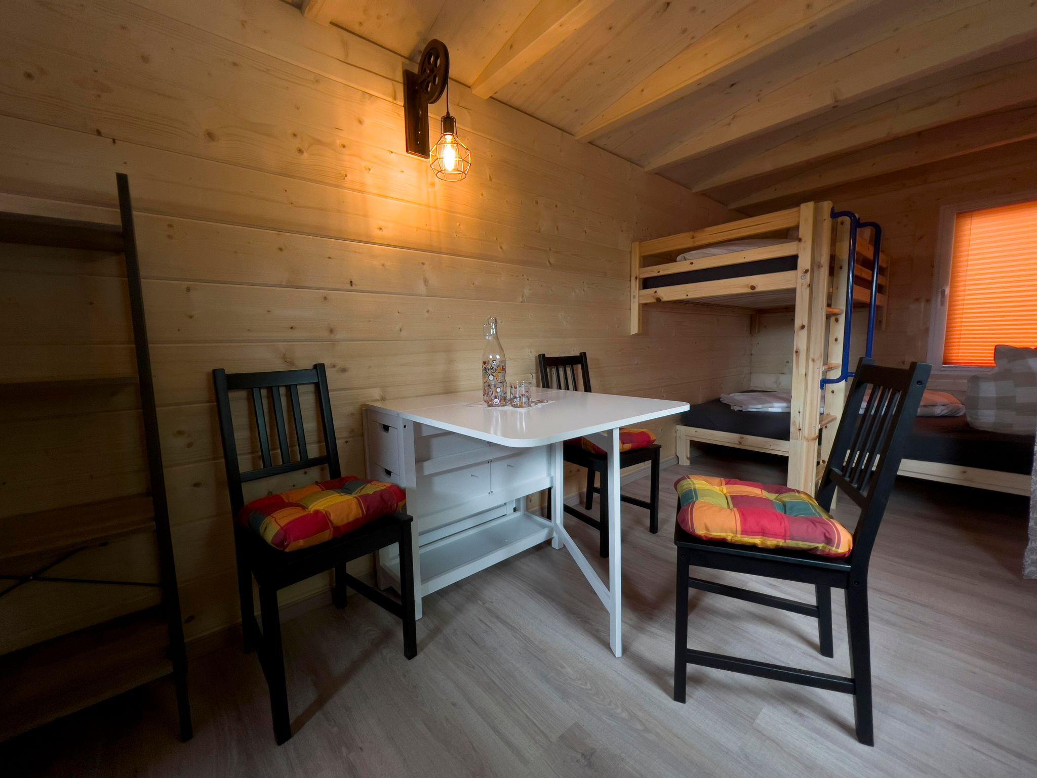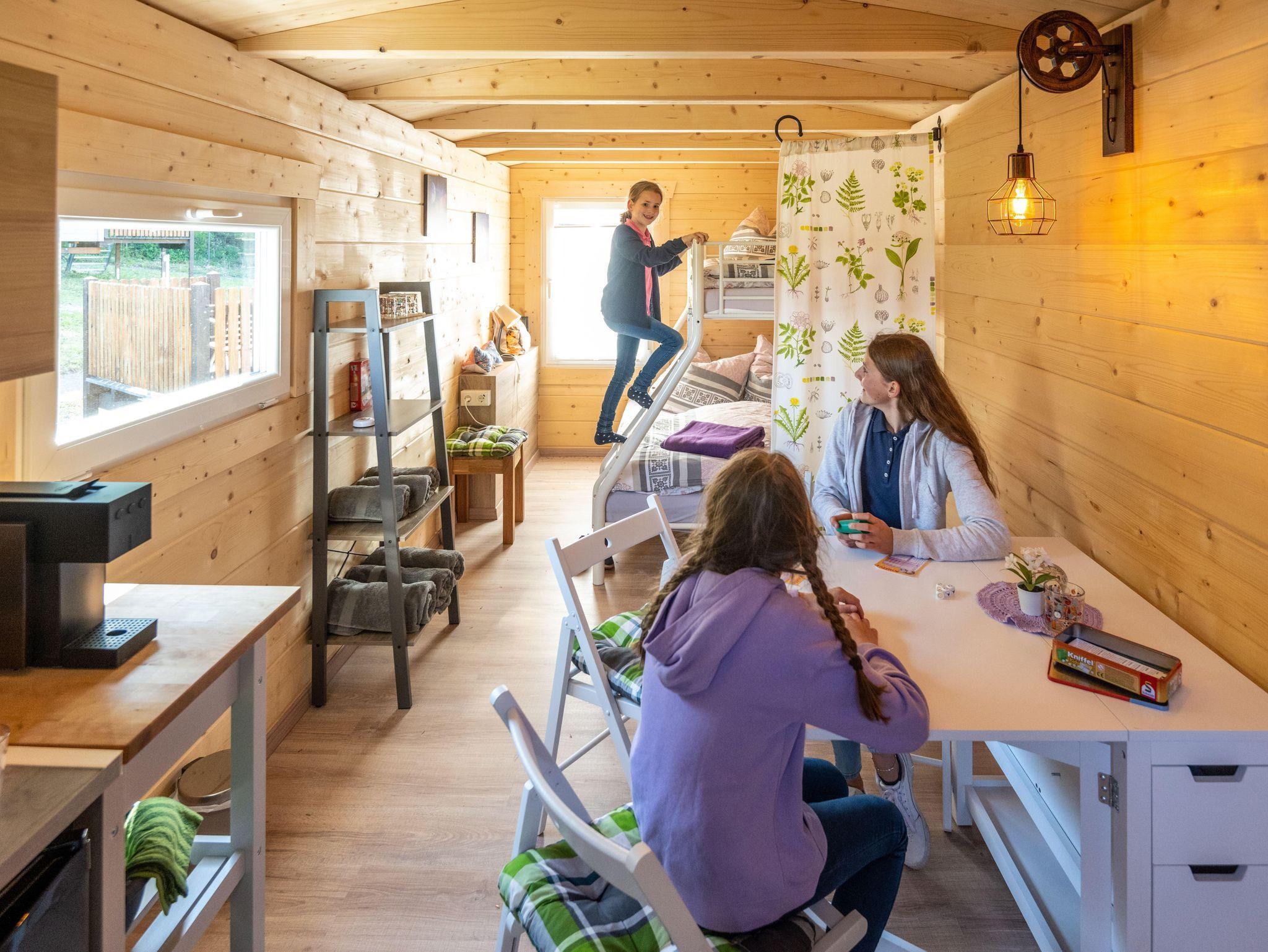 Die 3-Bett-Karren mit den Namen „Schäferkarren“, „Einhornhütte“, „Dumbo-Wagen“, „Bloxberg“, „Burgblick“ und „Köhlerwagen“ verfügen über ein Doppelbett, ein Etagenbett und auf Wunsch auch über ein Kinderbeistellbett.