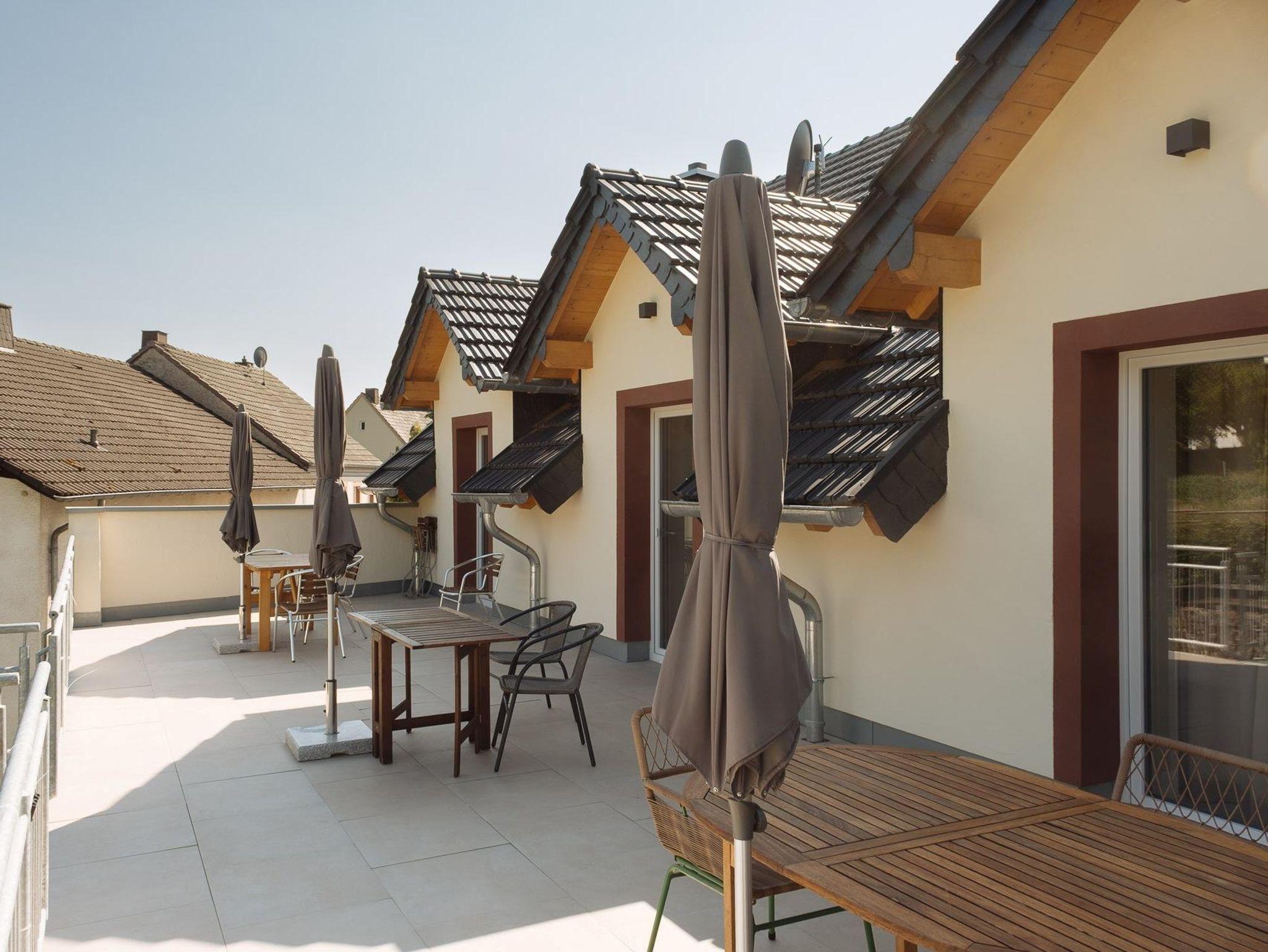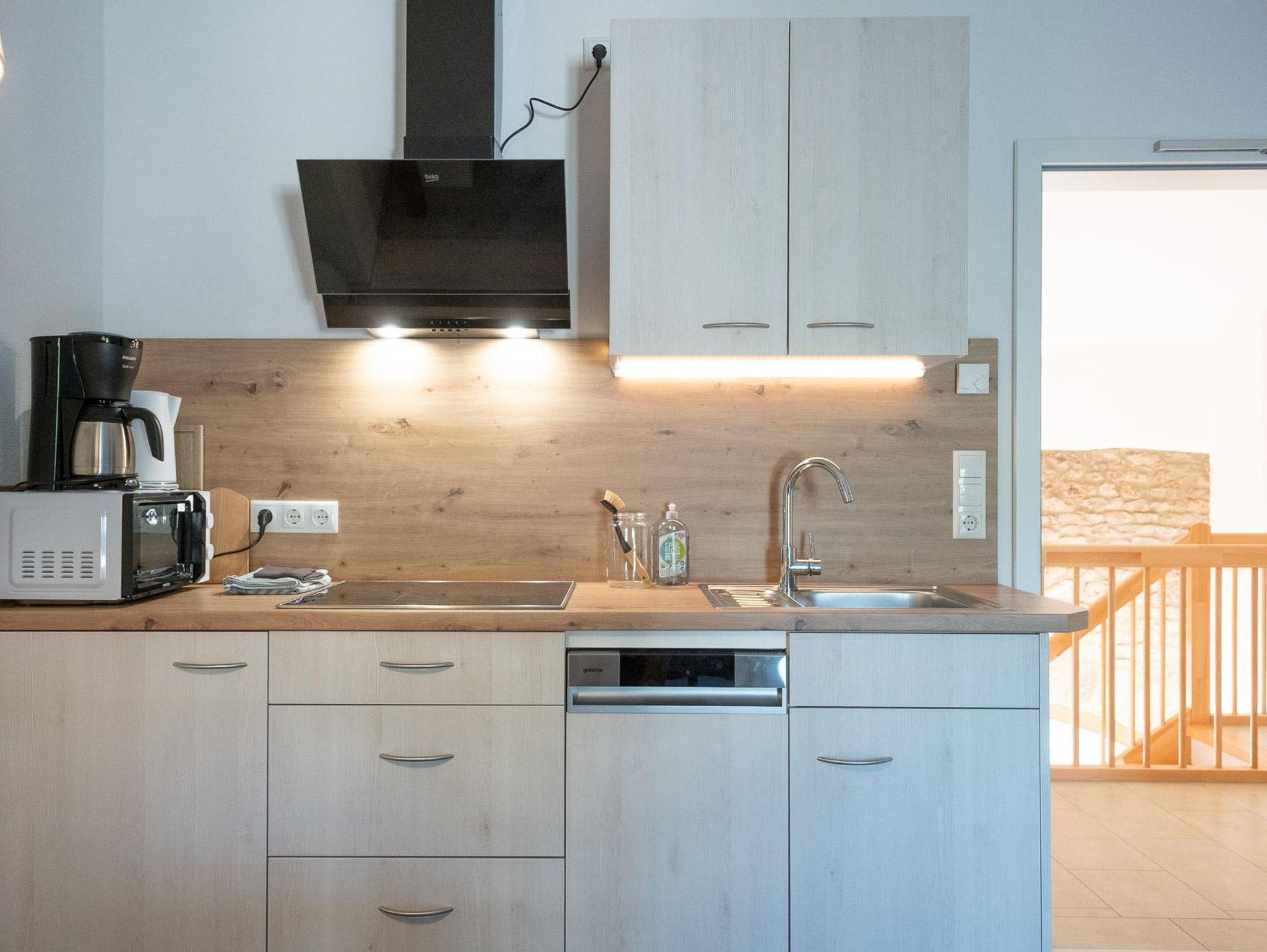 Dieses liebevoll eingerichtete Ferien-Appartment im ersten Obergeschoss einer umgebauten Bruchsteinscheune (Baujahr 1807) verbindet rustikalen Charme mit moderner Einrichtung und Komfort. Die 30-Quadratmeter-Wohnung ist ideal für Pärchen und Singles. In der kuscheligen Schlafnische mit Bruchsteinelementen steht ein gemütliches Doppelbett (160 cm breit). Daneben befindet sich ein modern eingerichtetes Duschbad. Im Hauptraum befindet sich eine moderne Einbauküche mit Spülmaschine und allem, was man zum Kochen braucht. In der Sitzecke mit zwei Sofas können Sie es sich mit einem Buch bequem machen. Oder vor dem Fernseher, der einen Satelittenanschluss hat und auch ans Internet angeschlossen ist. Von der Wohnküche gehen Sie direkt auf Ihre 20 Quadratmeter große, eigene Terrasse (Sonnenseite), die mit einem großen Sonneschirm und Gartenmöbel ausgestattet ist. Von der Terrasse kommen Sie über eine Treppe direkt in auf eine große Wiese, wo ein Holzhaus für Kinder steht und sich ein großer, überdachter Grill-/Feuerplatz befindet.