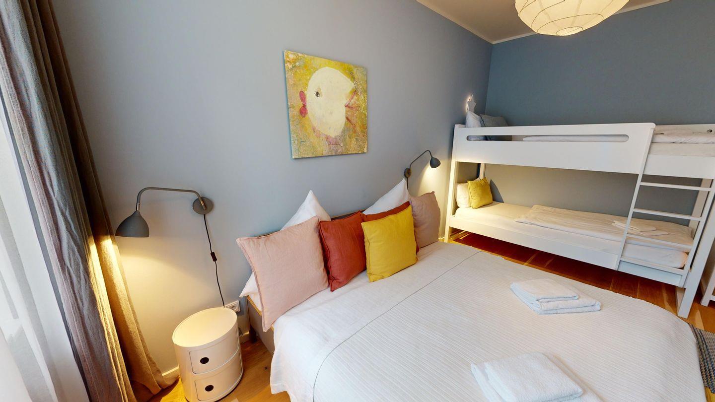 In dieser Wohnung gibt es zwei ruhige Schlafzimmer nach hinten gelegen, eins mit Doppelbett und eins mit Doppelbett und zusätzlichem Etagenbett. Besonders komfortabel sind die beiden Badezimmer, eines mit einer großzügigen Dusche und Badewanne sowie ein kleineres Gästebad mit Dusche.