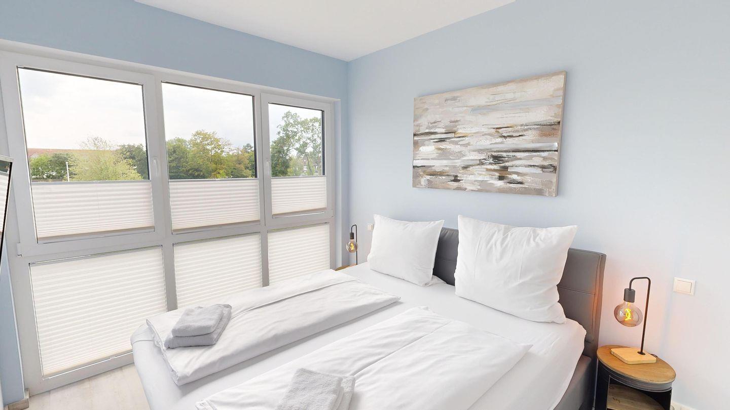 Jedes Schlafzimmer ist mit einem hochwertigen Boxspringbett und einem Smart- TV ausgestattet. Die elektrischen Außenjalousien sorgen für die perfekte Verdunkelung.