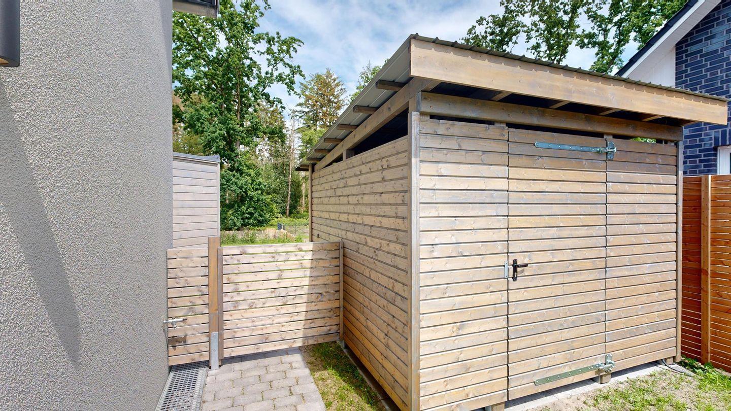 Ihre Autos können Sie bequem am Haus parken. Hier erwarten Sie zwei Stellplätze sowie ein abschließbarer und geräumiger Geräteschuppen, der viel Platz für Ihre Fahrräder und Sonstiges bietet. Eine Waschmaschine mit Trocknerfunktion befindet sich zu alleinigen Nutzung im einem gemeinschaftlichen Raum, den Sie über die hintere Terrasse erreichen. Damit Sie auch mit kleineren Kindern im Urlaub entspannen können, erwartet Sie eine Spielkiste im Flur und ein Hochstuhl. Die Treppe kann mit einem sich dort befindenden Treppennetz abgesperrt werden.
