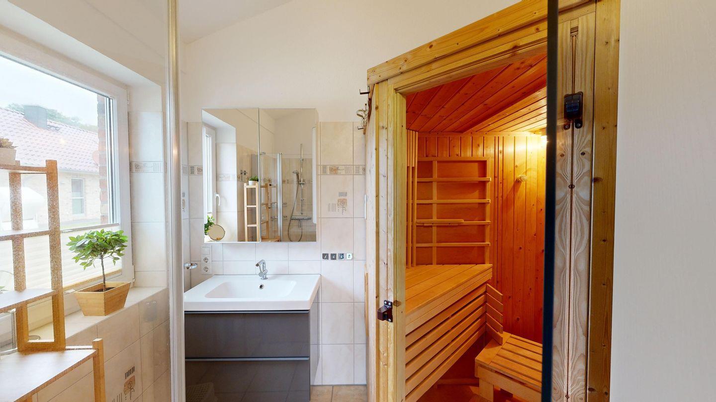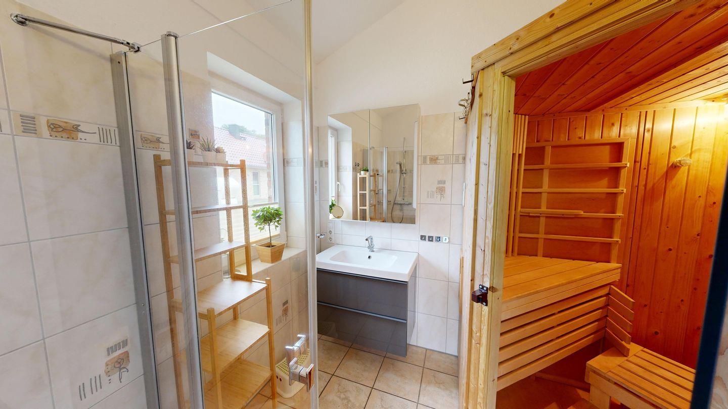 Im Erdgeschoss befindet sich ein großzügiger, heller Wohn-/Essbereich mit Kaminofen, einer einladenden Essecke und einer modernen, super ausgestatteten Küche. Zudem verfügt das Erdgeschoss über zwei Schlafzimmer, jedes mit einem Einzel- und einem Doppelbett. Zusätzlich gibt es im Erdgeschoss ein geräumiges Badezimmer mit Dusche und einer eigenen Sauna. Auf dem Dachboden gibt es zusätzlich einen Raum, der mit zwei Matratzen ausgestattet ist.