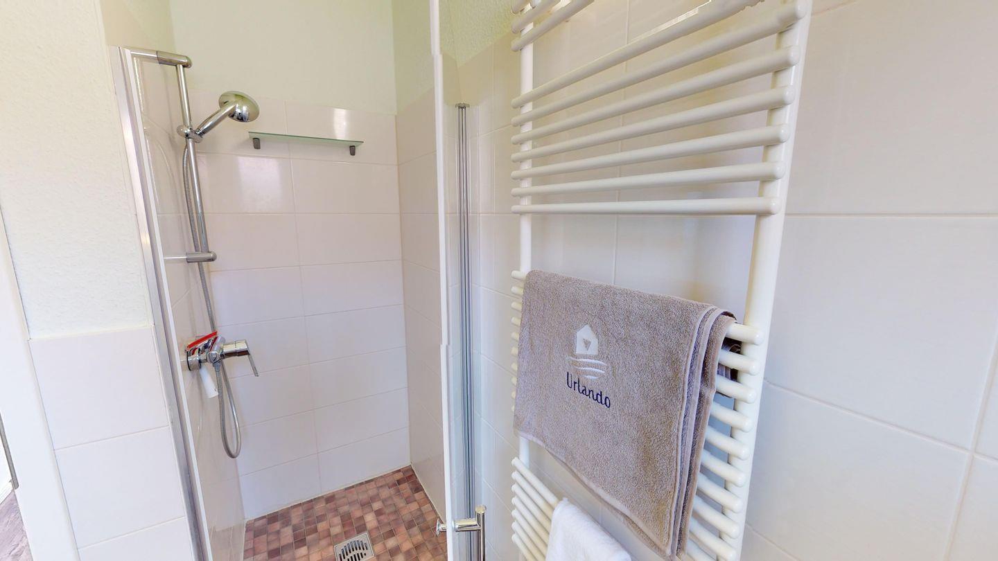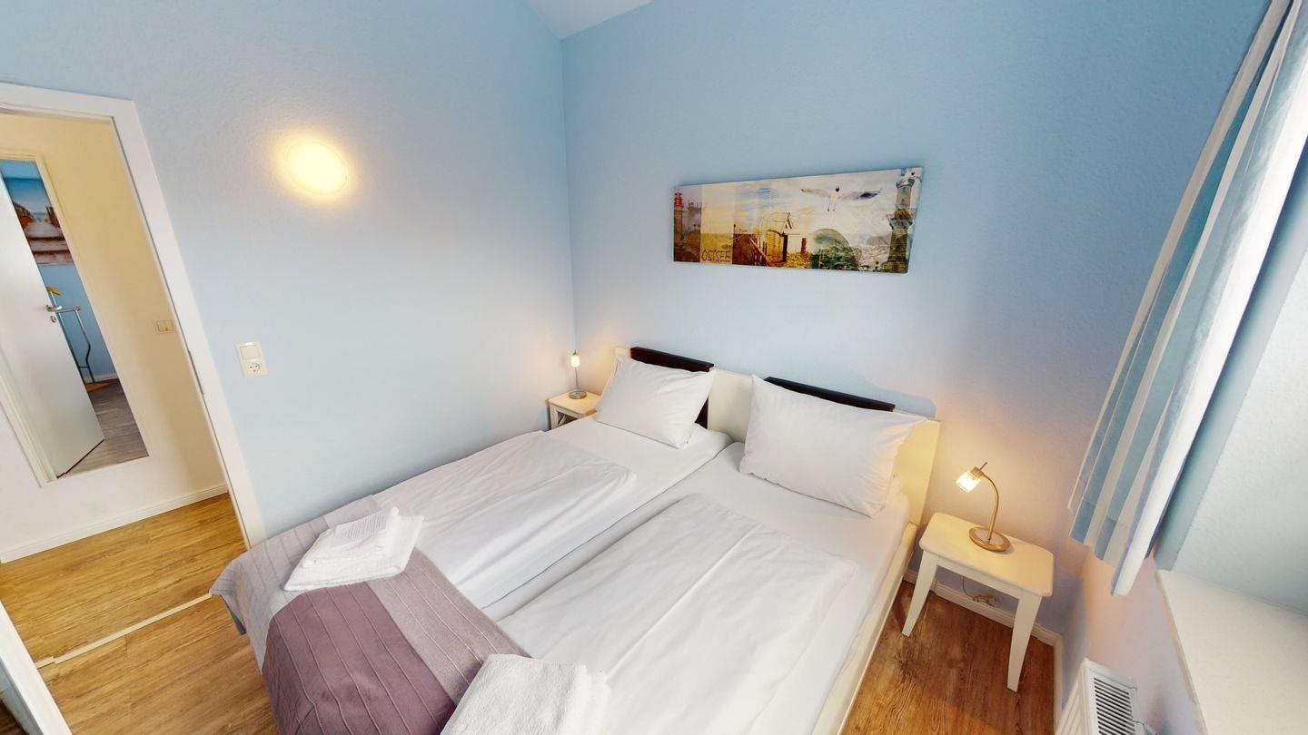 Ein Schlafzimmer verfügt über ein Doppelbett, das andere über zwei komfortable Einzelbetten. Es gibt ein helles Badezimmer mit WC und bodengleicher Dusche.