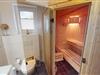 Im Erdgeschoss befindet sich das Wohnzimmer mit Kaminofen, Esszimmer und offener, voll ausgestatteter Einbauküche. Im hinteren Bereich liegen zwei Schlafzimmer mit jeweils einem Doppelbett. Abgerundet wird das Erdgeschoss durch das Duschbad mit Sauna sowie ein Gäste-WC. In der zweiten Etage steht ein großzügiger Raum mit zwei Einzelbetten zur Verfügung.