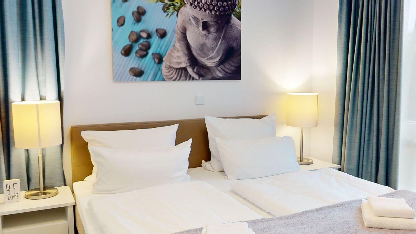 Die Wohnung im 1. OG verfügt über drei Zimmer - zwei Schlafzimmer mit Boxspring-Doppelbetten, ein Wohnzimmer mit einer Schlafcouch für zwei Personen und eine offene Küche. Zwei Bäder, jeweils mit Dusche und Badewanne, bieten großen Komfort.