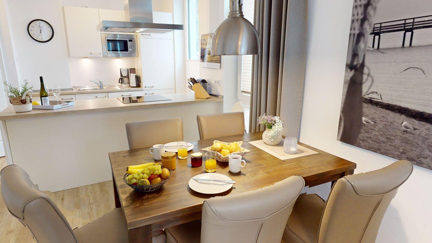 Sie ist für eine Belegung mit bis zu 6 Personen ausgelegt und auch Ihr Hund ist willkommen. Von der möblierten Terrasse der 85 m² großen Wohnung haben Sie einen eingeschränkten Blick auf die Ostsee.