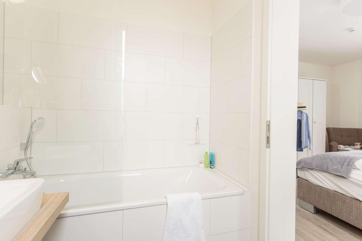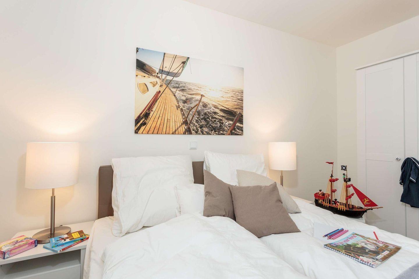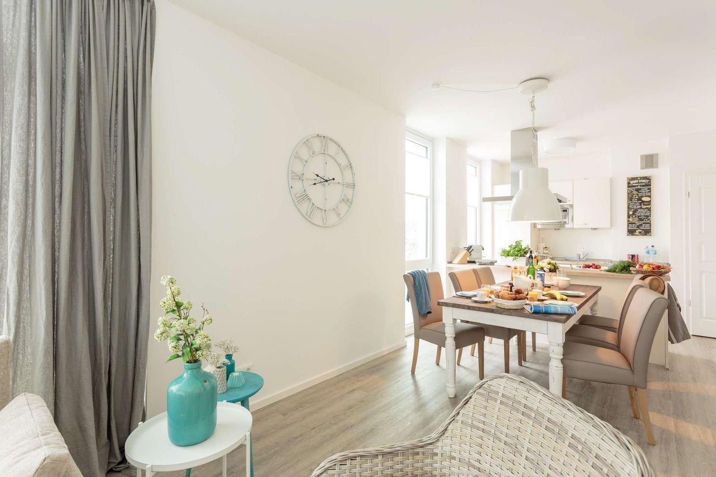Die 85 m² Wohnfläche verteilen sich auf ein lichtdurchflutetes Wohnzimmer mit Essbereich und einer voll ausgestatteten Küche. Zusätzlich gibt es zwei Schlafzimmer, jeweils mit einem Boxspring-Doppelbett. Ein Badezimmer mit Badewanne befindet sich direkt angrenzend an einem der Schlafzimmer, während das andere Badezimmer mit Dusche separat liegt. Die Wohnung ist allergikerfreundlich.