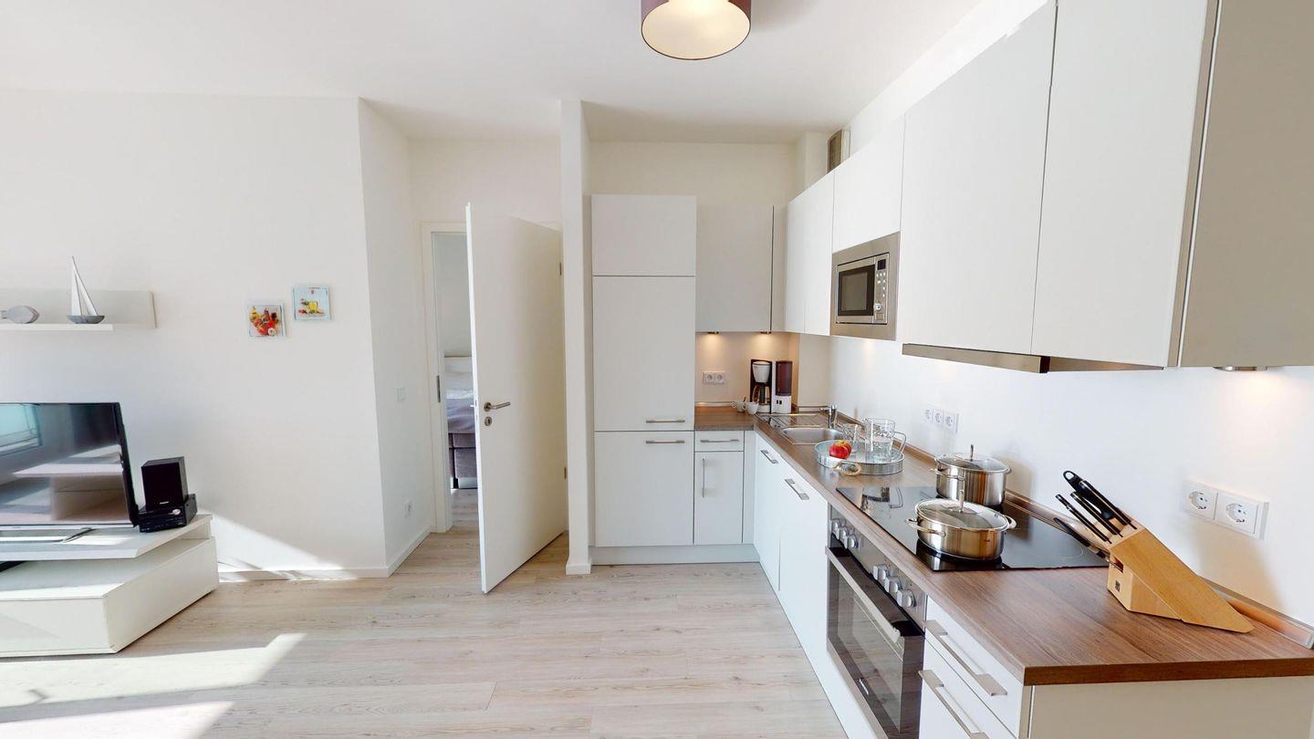 Das Apartment erwartet Sie mit einem lichtdurchfluteten Wohnbereich, einer gemütlichen Essecke und einer offenen, voll ausgestatteten Einbauküche. Das komfortable Sofa kann als Schlafmöglichkeit für zwei Personen genutzt werden, und Sie können dabei den Meerblick aus der Fensterfront genießen. Weiterhin verfügt das Apartment über ein Bad mit Badewanne und Dusche. Abgerundet wird es durch das Schlafzimmer mit einem Boxspring-Doppelbett.