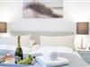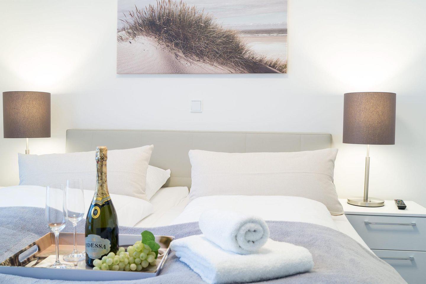 Der einladende Flur führt Sie rechterhand in das Badezimmer mit Dusche und Badewanne. Zurück auf dem Flur führt Sie Ihr Weg direkt in das Herzstück des Apartments - den Wohnbereich. Eine offene Einbauküche, ein Essbereich, eine Sofaecke sowie eine große Fensterfront mit Meerblick laden zum Verweilen ein. Das Sofa bietet eine Schlaffunktion für zwei Personen. Weiterhin gibt es ein Schlafzimmer mit Boxspring-Doppelbett.