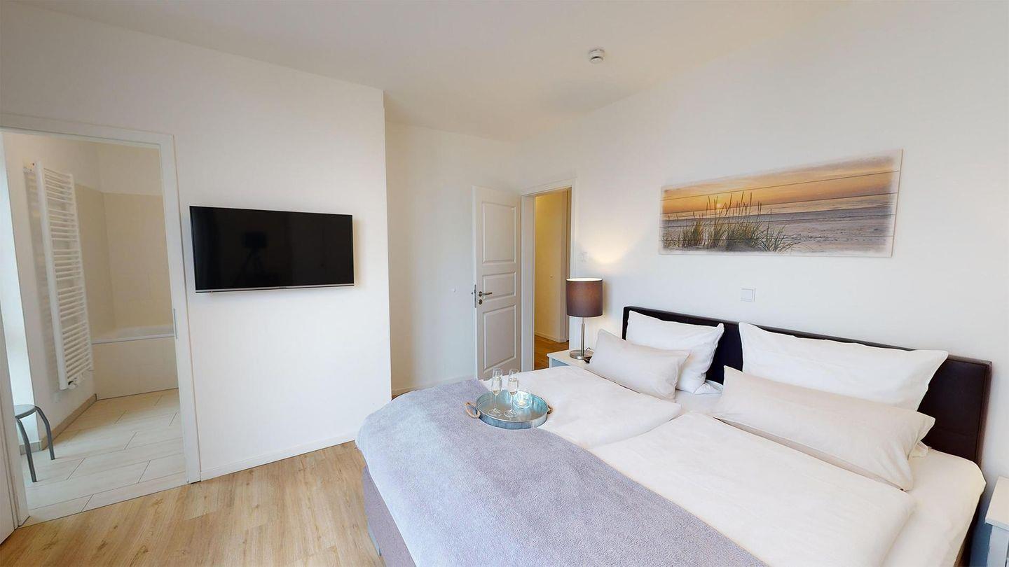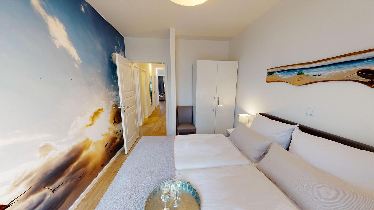 Der einladende Flur mit Garderobe und großem Spiegel führt Sie linkerhand direkt in das erste der drei hellen und freundlichen Schlafzimmer. Die Ausstattung besteht aus einem Boxspring-Doppelbett und einem Kleiderschrank. Weiter über den Flur gelangen Sie wiederum linkerhand in das größte Schlafzimmer mit gleicher Ausstattung plus Flachbildfernseher und Zugang zu einem eigenen Vollbad. Hinter den letzten beiden Türen des Flurs befindet sich das zweite Badezimmer, dieses mit gläserner Dusche und das dritte Schlafzimmer, mit einem Einzelbett, das über eine Ausziehfunktion verfügt und sich somit ein weiterer Schlafplatz eröffnet.
