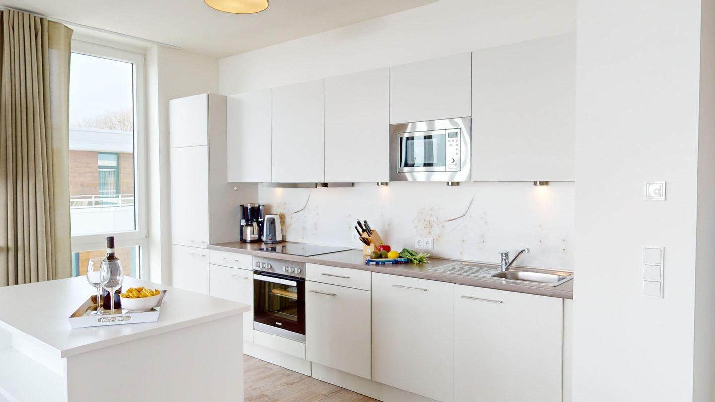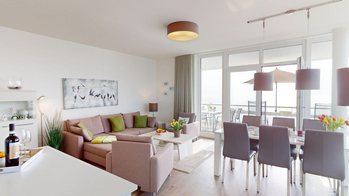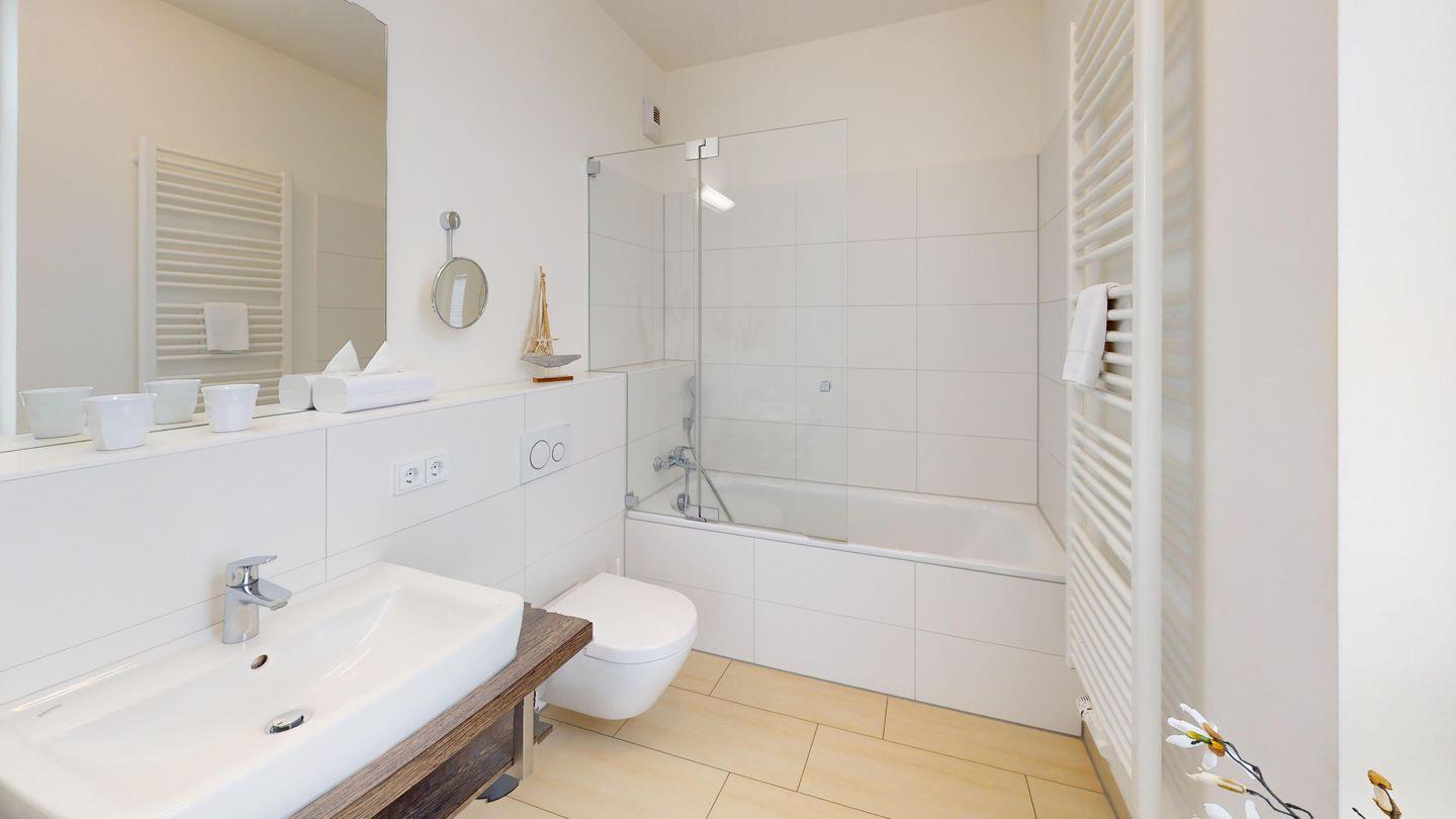 Die 4-Zimmer-Wohnung im dritten Obergeschoss ist mit 99 m² für sechs Personen ausgerichtet. Im großen Wohnzimmer mit Küchenzeile genießen Sie Ihre Mahlzeiten und können gesellschaftliche Abende verbringen. Drei Schlafzimmer für je zwei Personen, dazu zwei Bäder (je eines mit Dusche und eines mit Badewanne) bieten größtmöglichen Komfort. Zwei der Schlafzimmer sind mit einem komfortablen Boxspringbett ausgestattet, das dritte Schlafzimmer verfügt über ein Einzelbett und ein ausziehbares "Kojenbett". Vom Balkon haben Sie den perfekten Meerblick über die Lübecker Bucht.