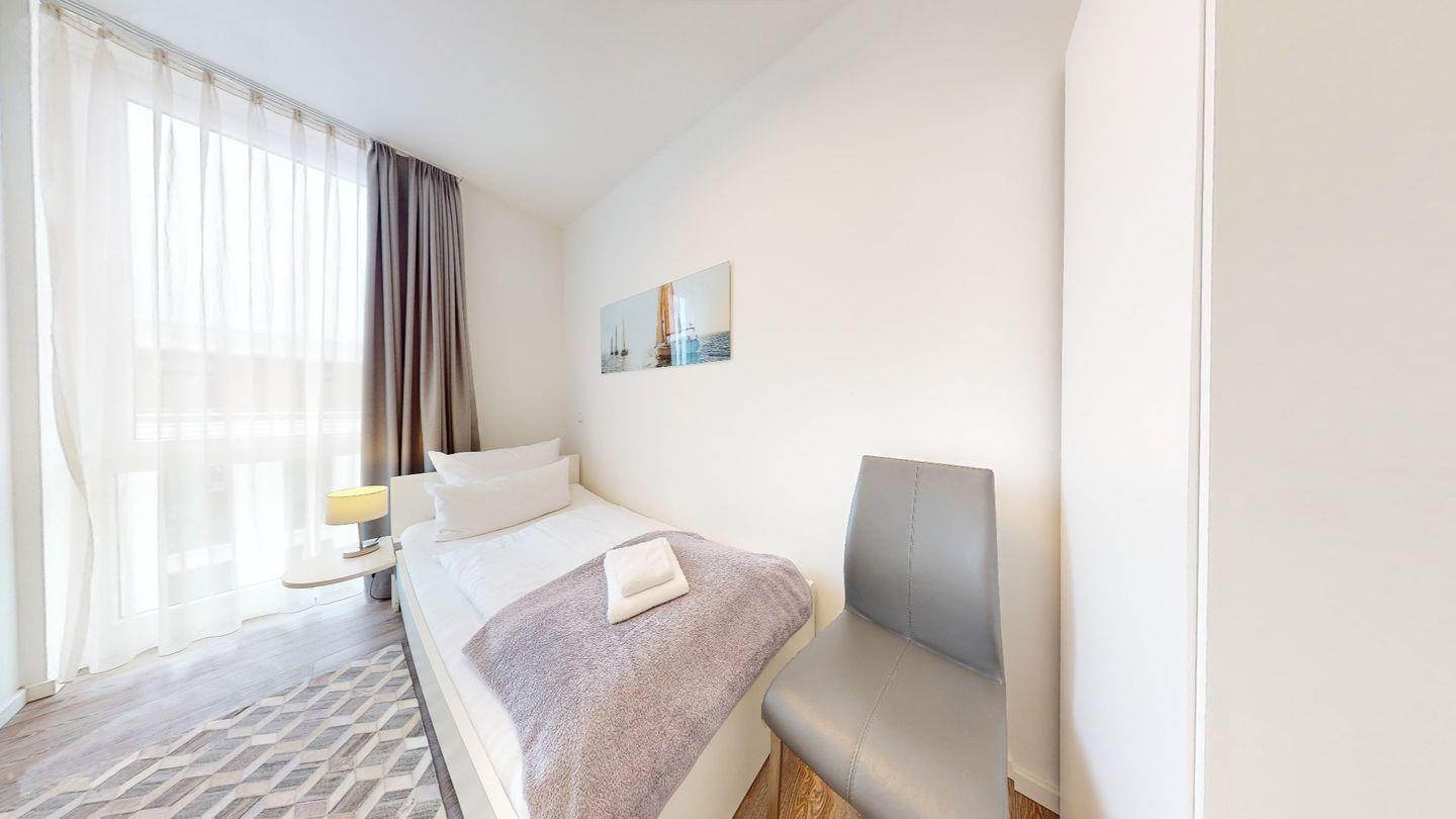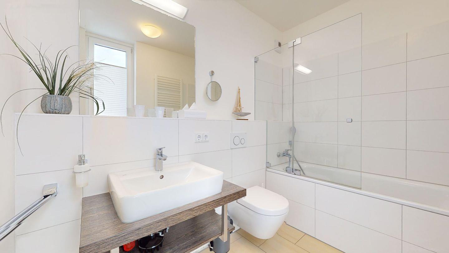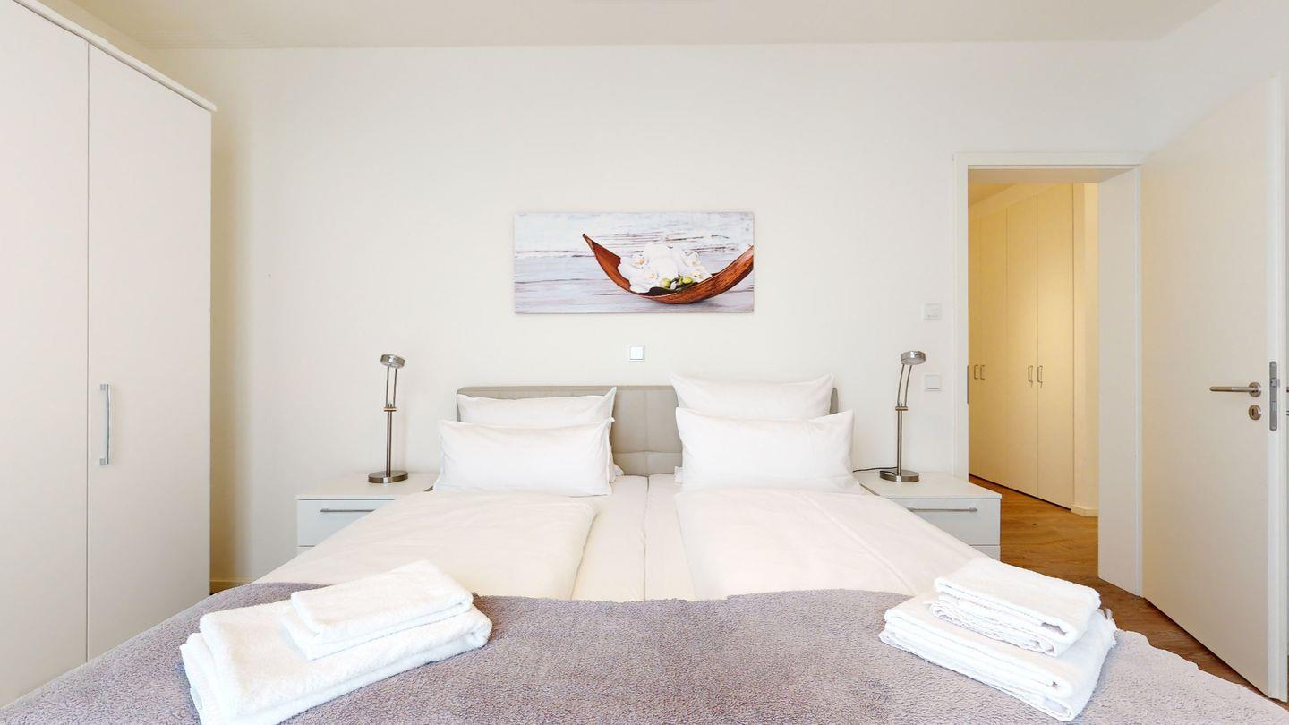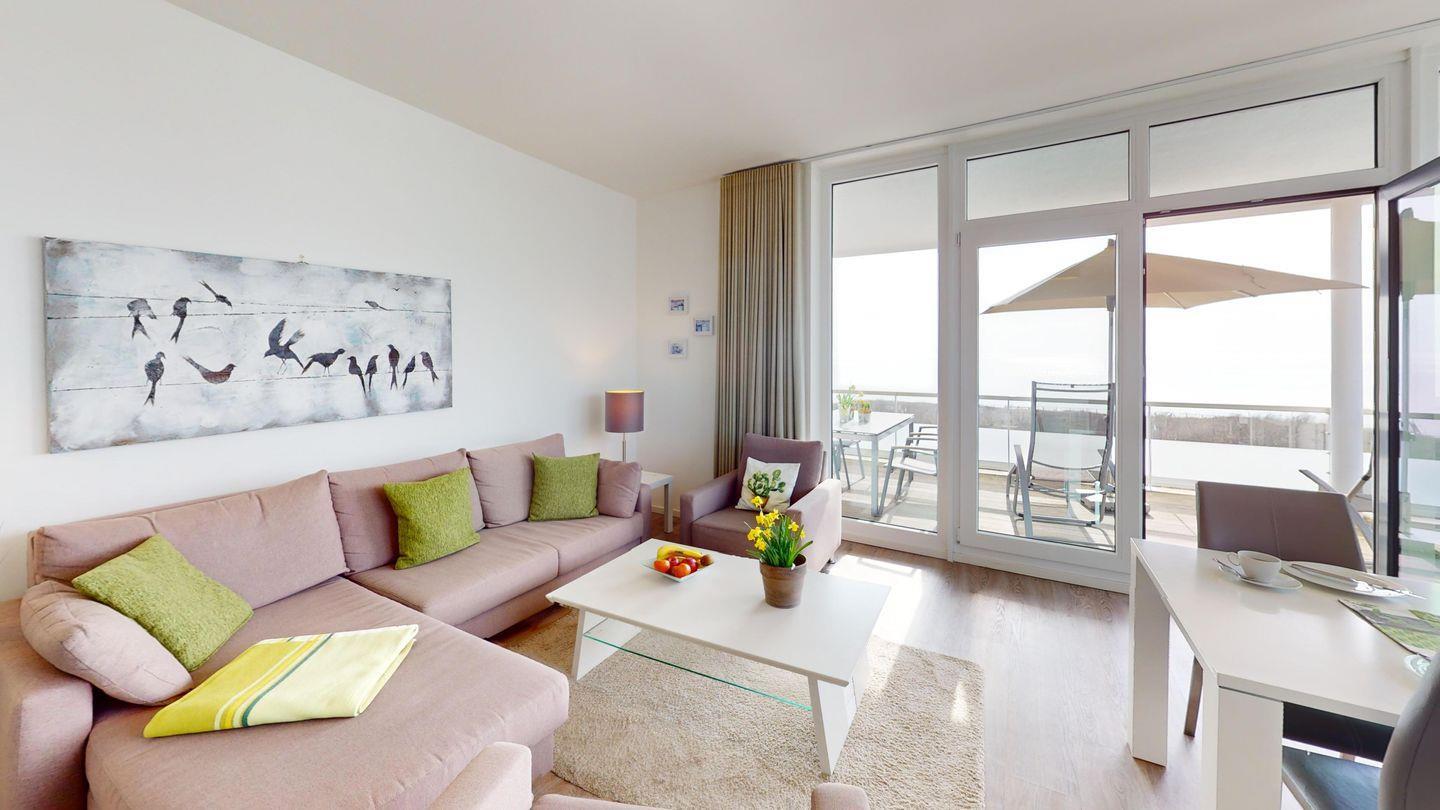 Die 4-Zimmer-Wohnung im dritten Obergeschoss ist mit 99 m² für sechs Personen ausgerichtet. Im großen Wohnzimmer mit Küchenzeile genießen Sie Ihre Mahlzeiten und können gesellschaftliche Abende verbringen. Drei Schlafzimmer für je zwei Personen, dazu zwei Bäder (je eines mit Dusche und eines mit Badewanne) bieten größtmöglichen Komfort. Zwei der Schlafzimmer sind mit einem komfortablen Boxspringbett ausgestattet, das dritte Schlafzimmer verfügt über ein Einzelbett und ein ausziehbares "Kojenbett". Vom Balkon haben Sie den perfekten Meerblick über die Lübecker Bucht.