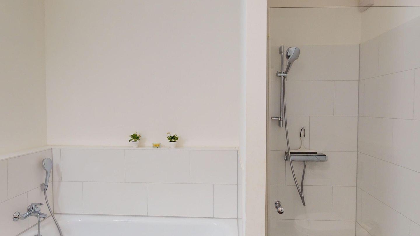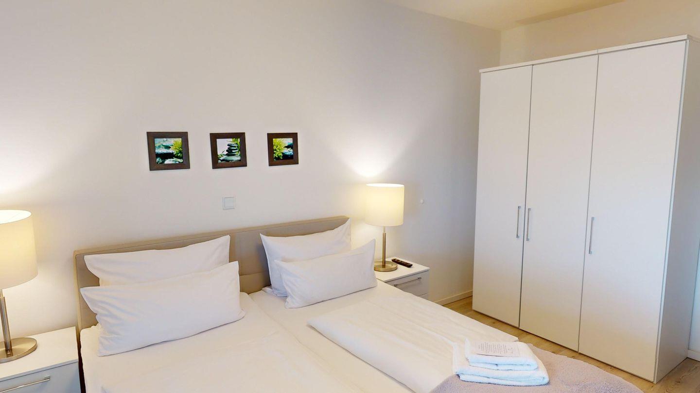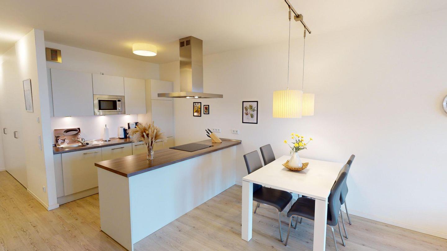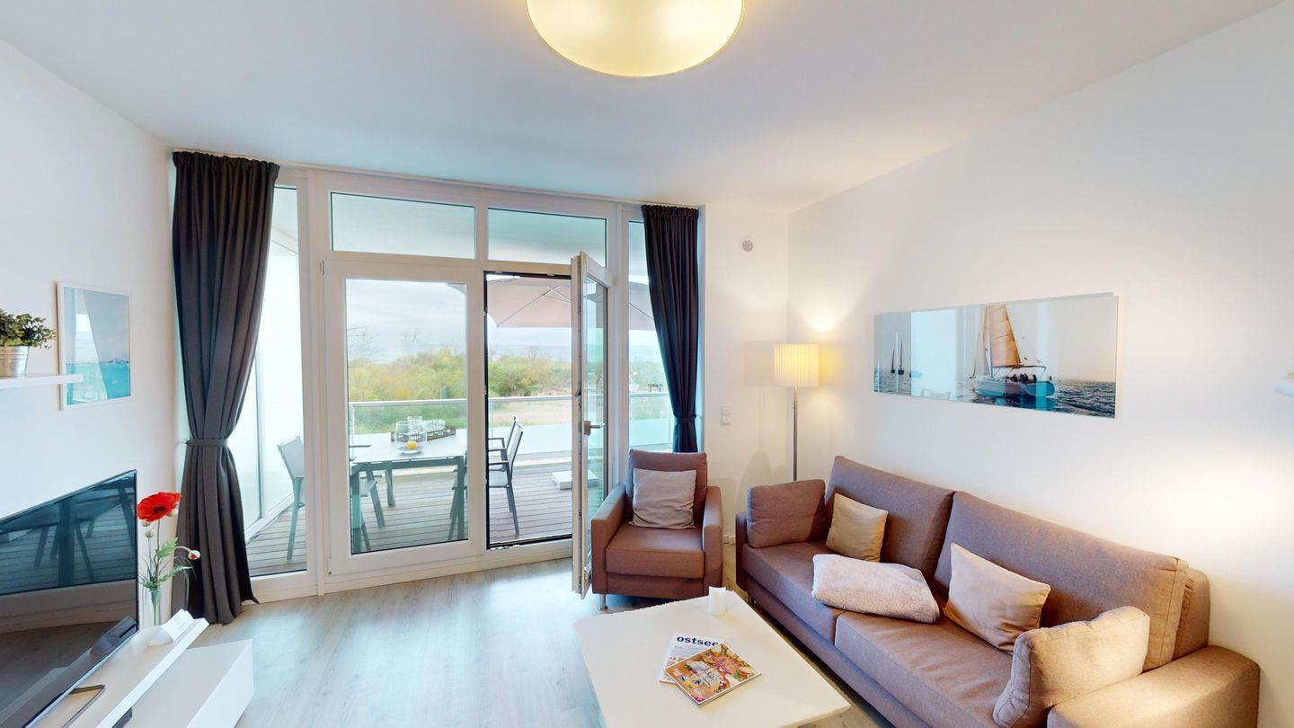 Der Eingangsbereich empfängt Sie mit einem großen Ganzkörperspiegel sowie Garderobenschrank und führt Sie geradeaus in den modernen und lichtdurchfluteten Wohnbereich. Die offene, voll ausgestattete Einbauküche, ein einladender Essplatz und ein gemütlicher Sofabereich, mit großem Flachbildfernseher machen das Urlaubsgefühl perfekt! Genießen Sie vom Sofa aus, den einmaligen Blick auf die Ostsee! Das Sofa bietet eine bequeme Schlaffunktion für eine Person. Rechterhand vom Wohnbereich gelangen Sie einerseits in das Badezimmer, mit Badewanne und Dusche und durch eine weitere Tür in das komfortable Schlafzimmer. Ein tolles Boxspring-Doppelbett, ein weiterer Flachbildfernseher und ein geräumiger Kleiderschrank gehören zur Ausstattung. Sowohl über das Wohnzimmer, als auch über das Schlafzimmer können Sie den großzügigen Balkon betreten. Ein Tisch mit vier Stühlen sowie zwei Sonnenliegen laden Sie ein, den fantastischen Ostseeblick zu genießen!