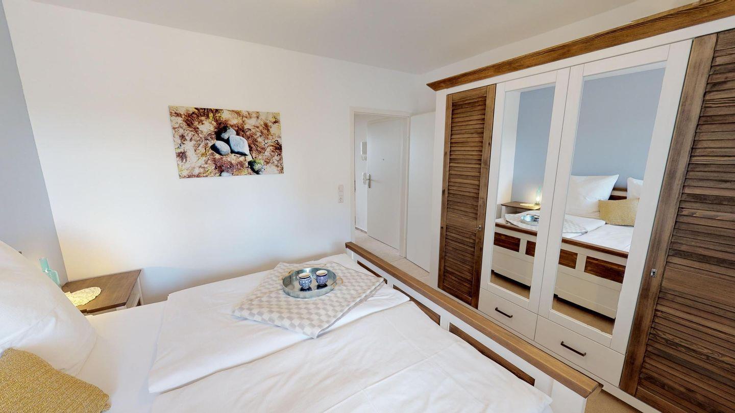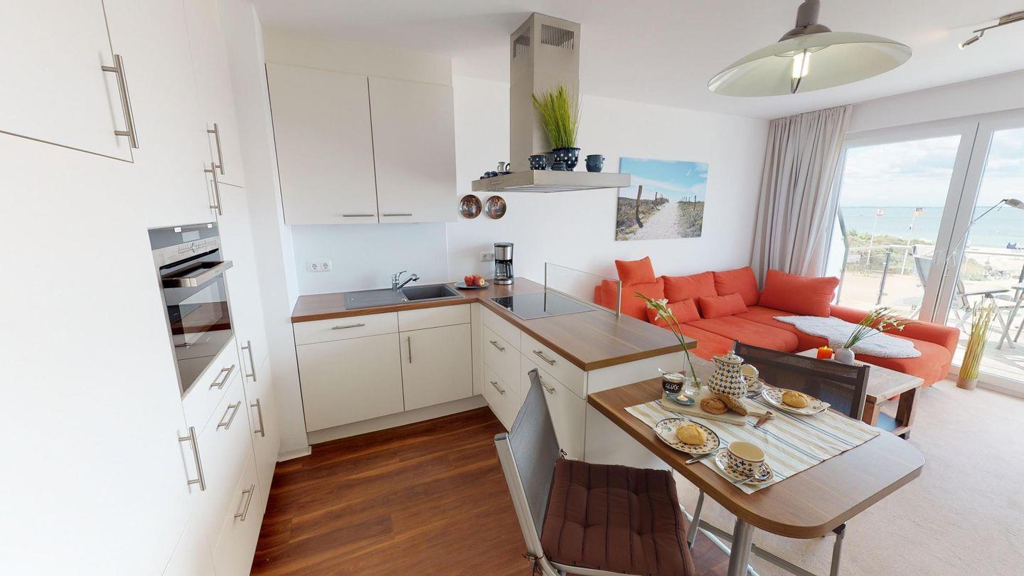 Sie erwartet ein gemütliches Schlafzimmer mit Doppelbett, ein modernes Duschbad mit Waschmaschine sowie ein heller Wohnbereich mit Schlafsofa. Die offene Küche ist voll ausgestattet und lädt zum gemeinsamen Kochen ein. Der möblierte Balkon mit Meerblick ist das Highlight der Wohnung – perfekt für entspannte Abende oder das Frühstück mit Sonnenaufgang.