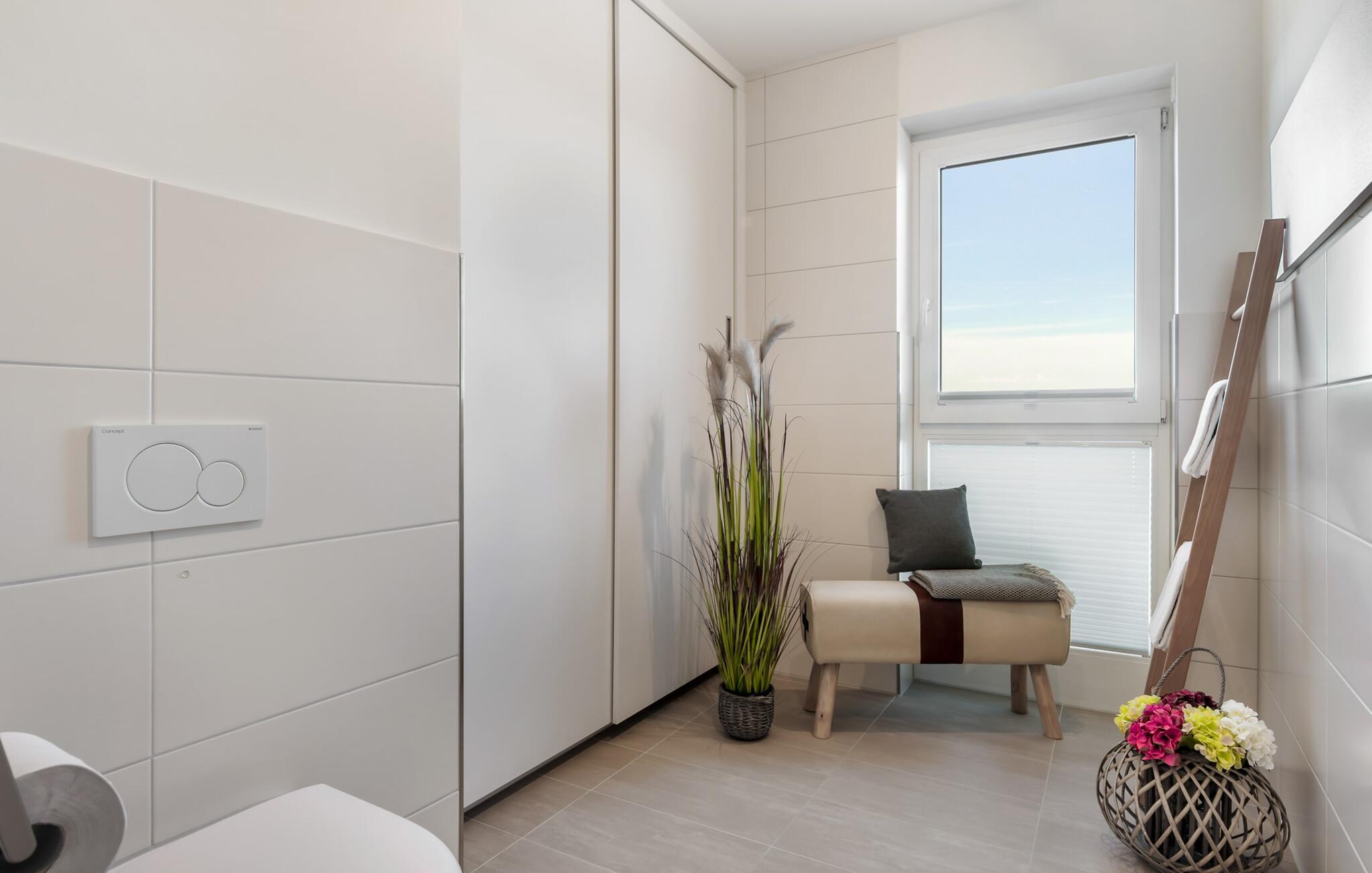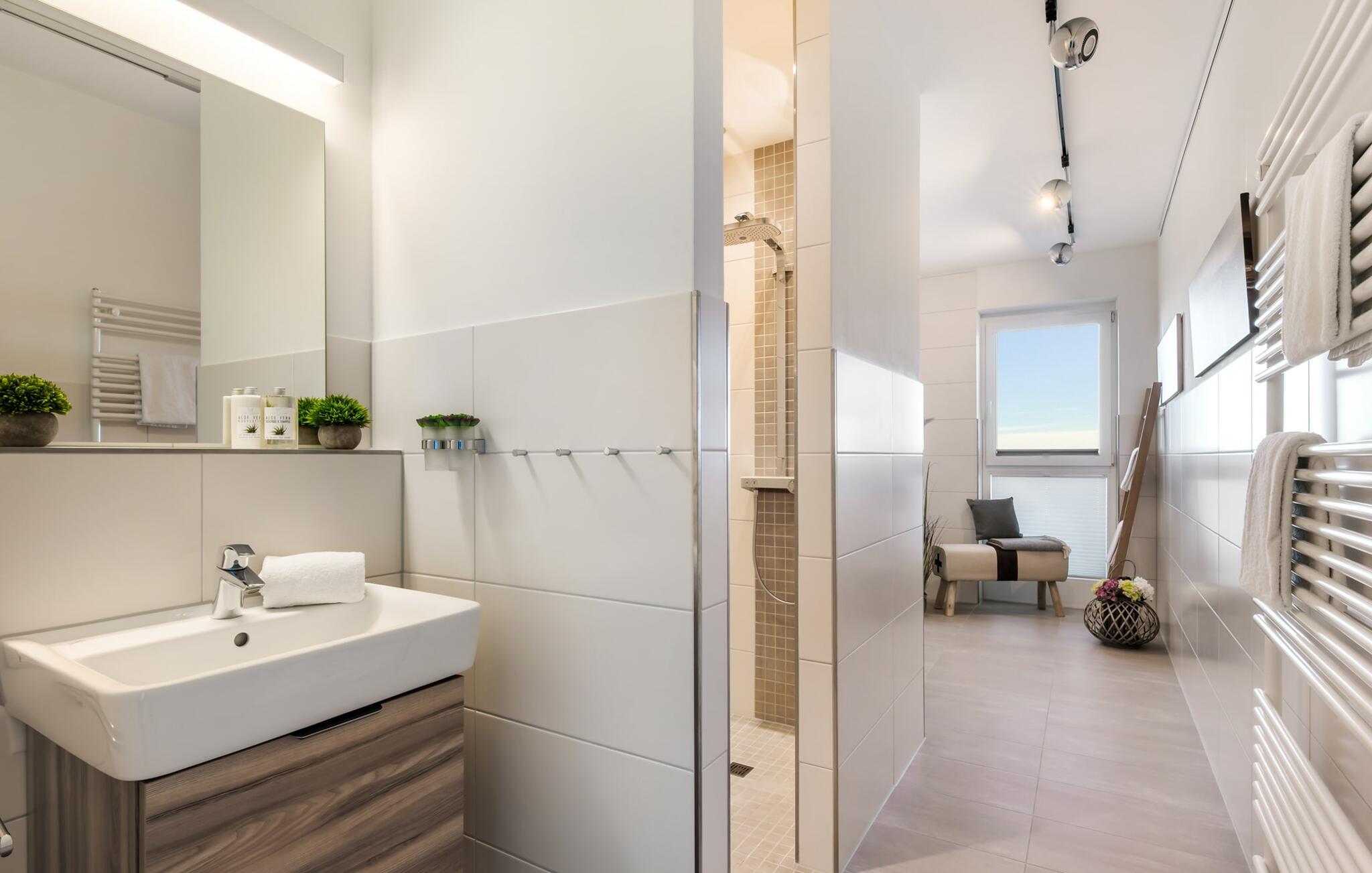 Ein zweites elegantes Bad verwöhnt Sie ebenfalls mit einer großen begehbaren Dusche, die bodengleich ist und für einen entspannten Start in jeden Tag sorgt.