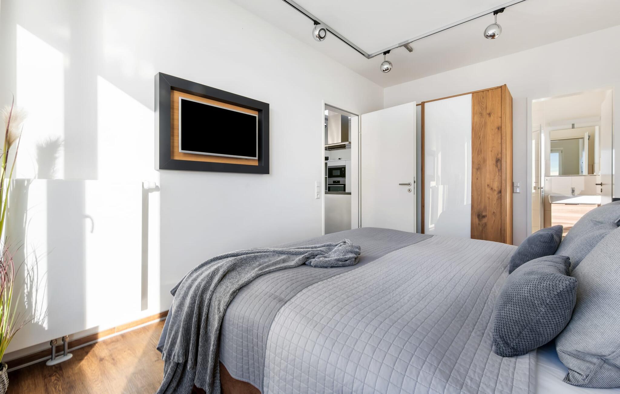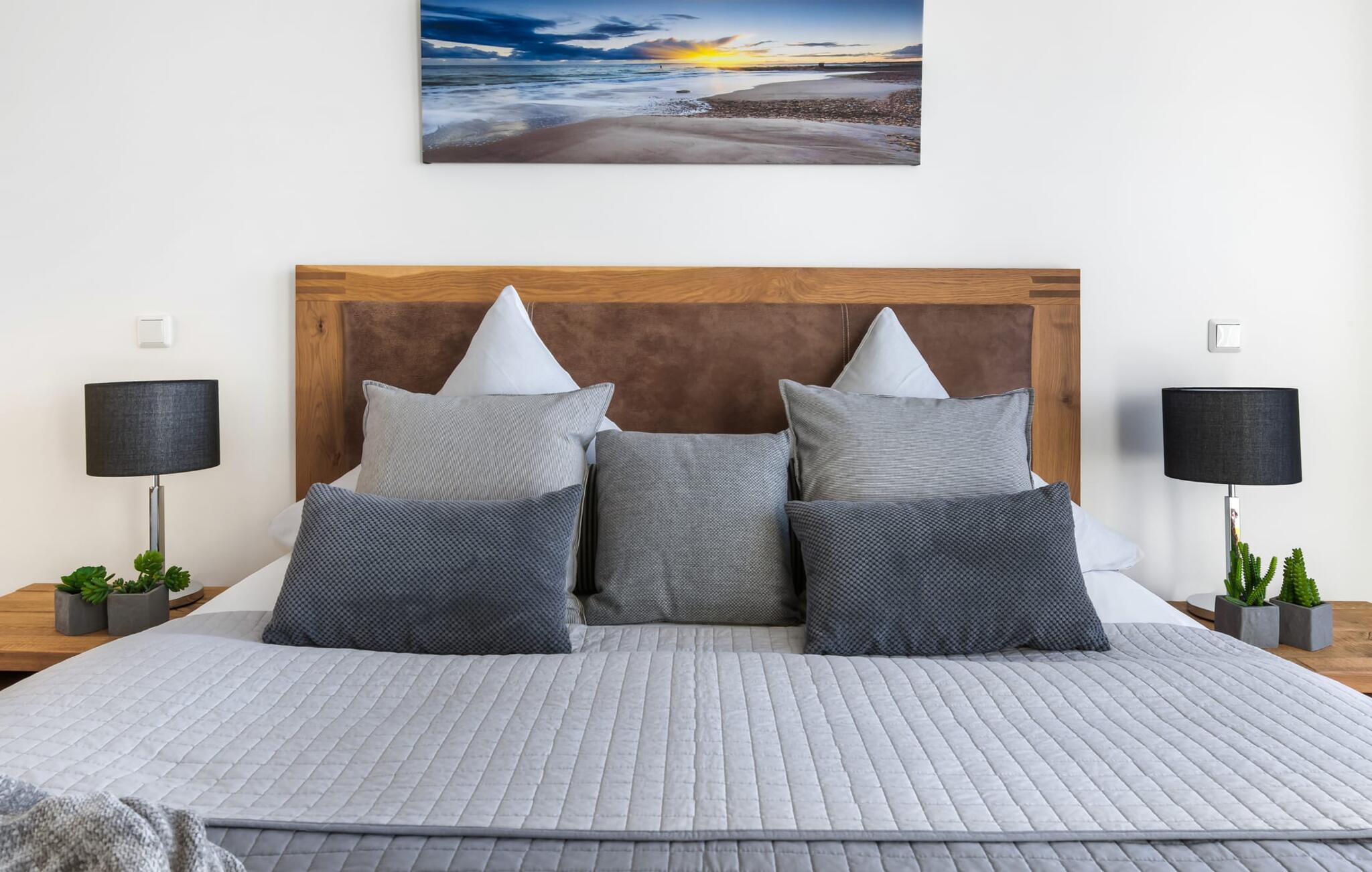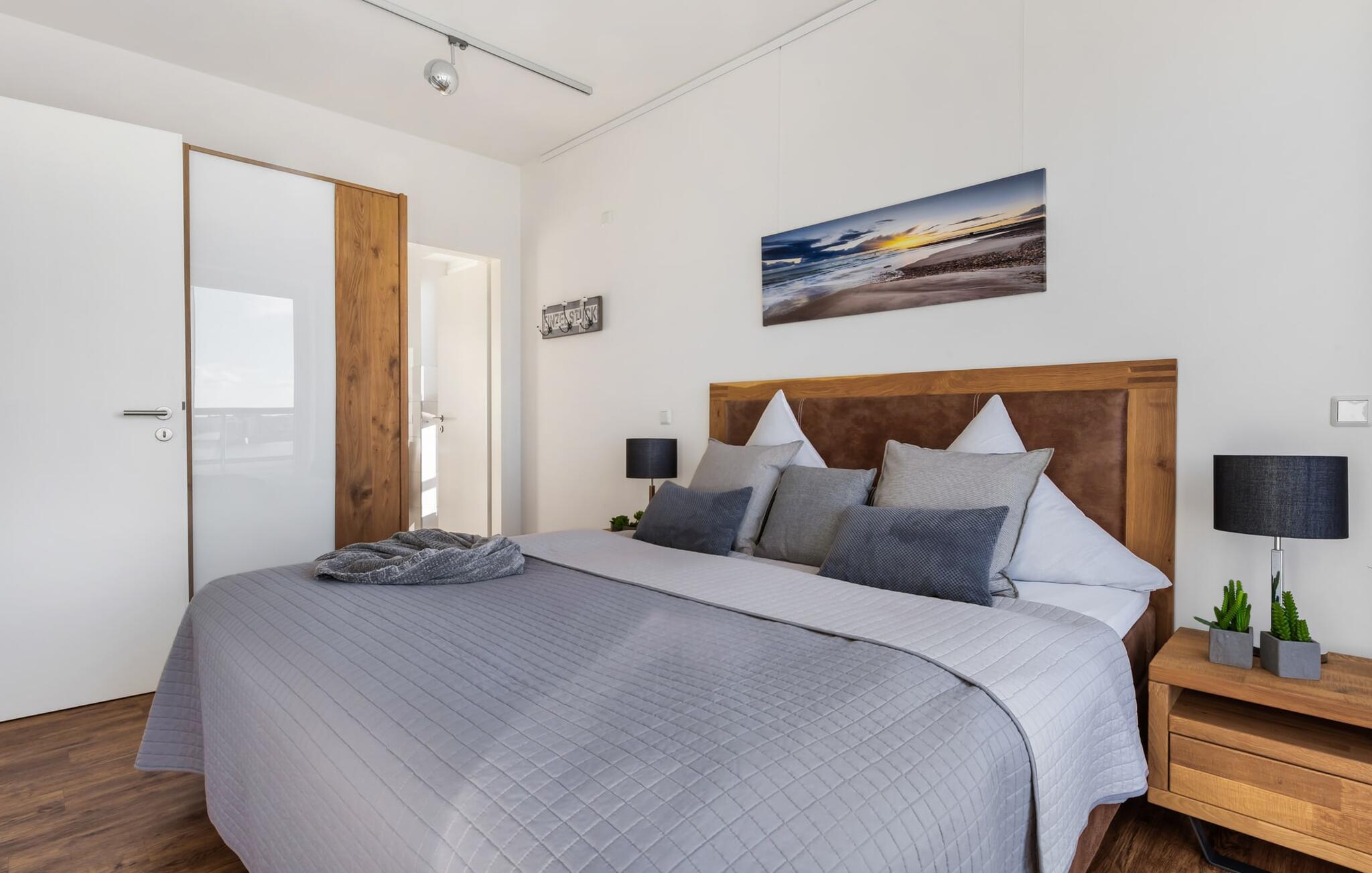 Beide Schlafzimmer bieten Zugang zur umlaufenden Terrasse und verfügen jeweils über ein bequemes 180x200 Doppel-Boxspringbett, einen LCD-Fernseher und blickdichte Plisseevorhänge. Eines davon verfügt über ein eigenes Bad mit bodengleicher Dusche. Erholsamer Schlaf ist in jedem Fall garantiert und das Einschlafen und Aufwachen mit dieser Aussicht ist ein HOCHGENUSS.