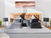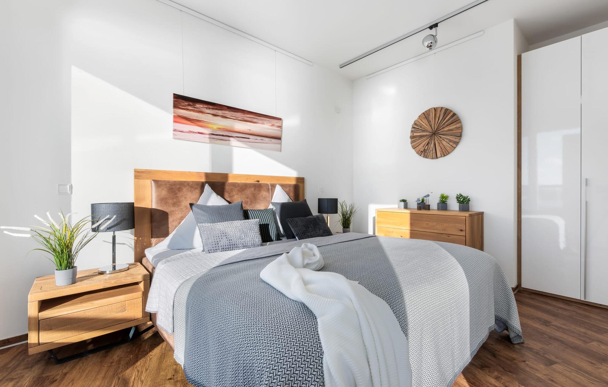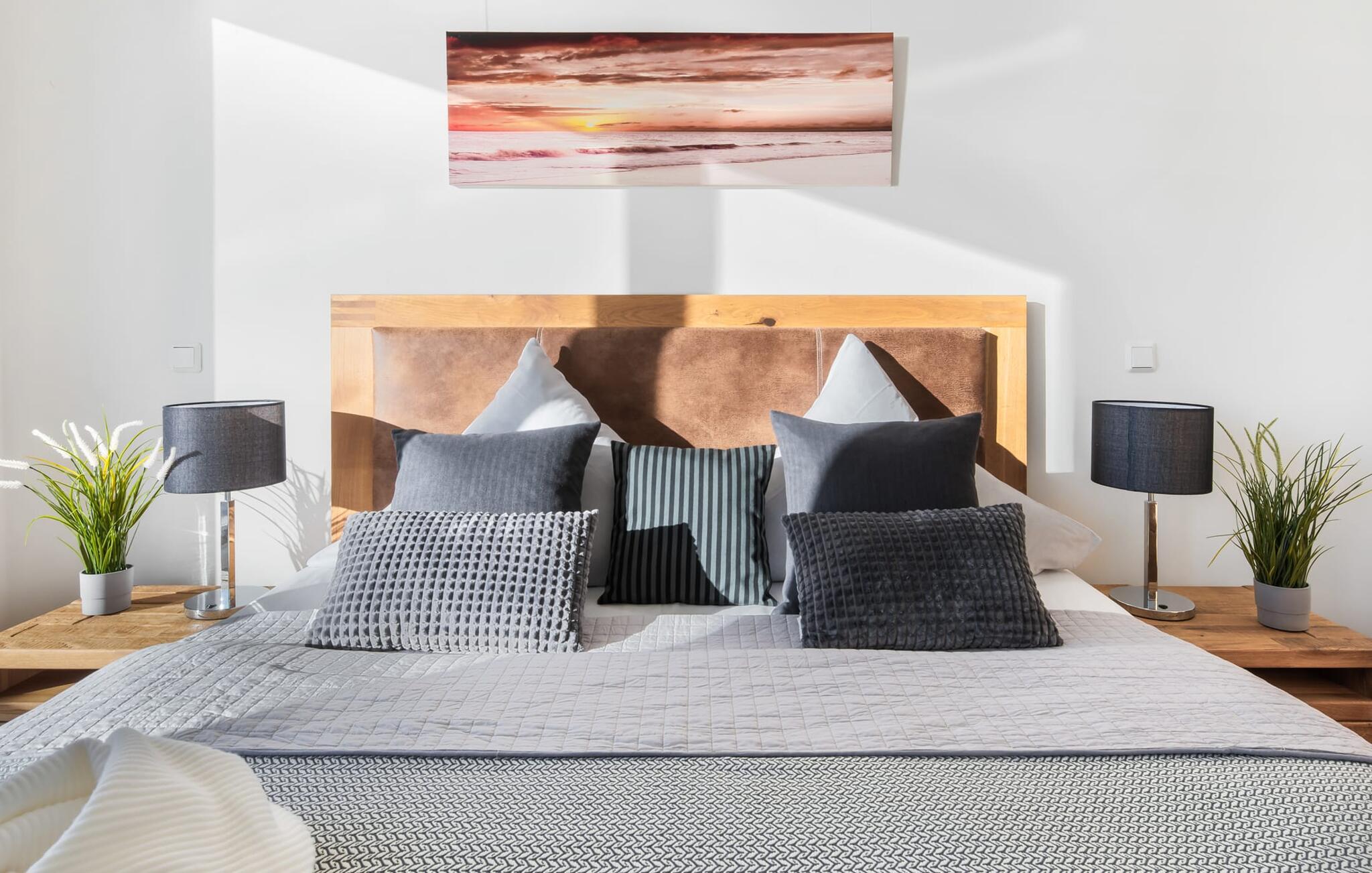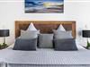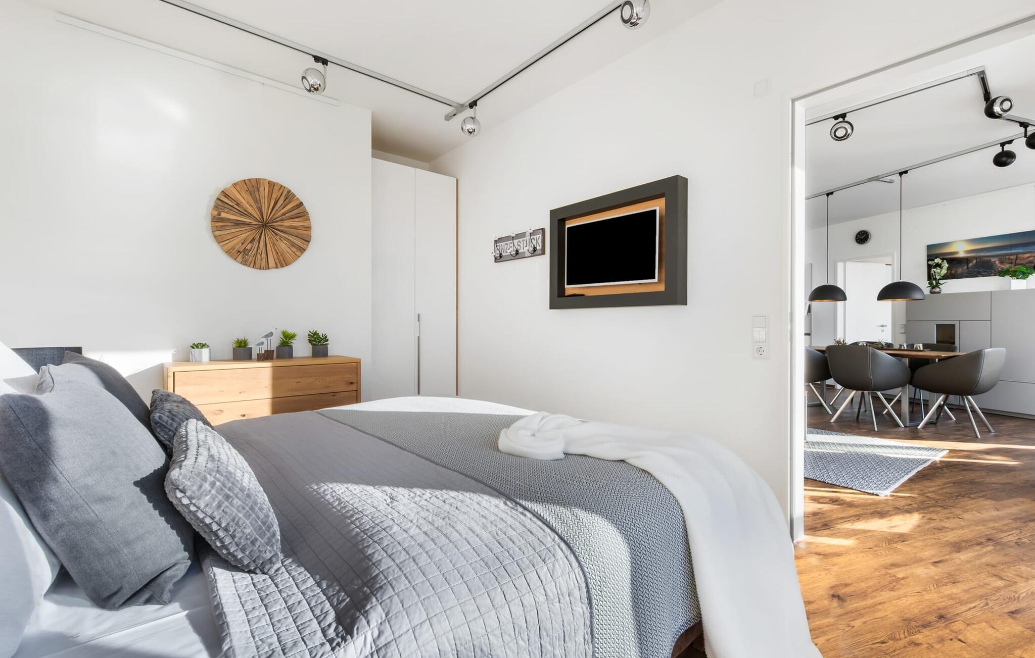 Beide Schlafzimmer bieten Zugang zur umlaufenden Terrasse und verfügen jeweils über ein bequemes 180x200 Doppel-Boxspringbett, einen LCD-Fernseher und blickdichte Plisseevorhänge. Eines davon verfügt über ein eigenes Bad mit bodengleicher Dusche. Erholsamer Schlaf ist in jedem Fall garantiert und das Einschlafen und Aufwachen mit dieser Aussicht ist ein HOCHGENUSS.